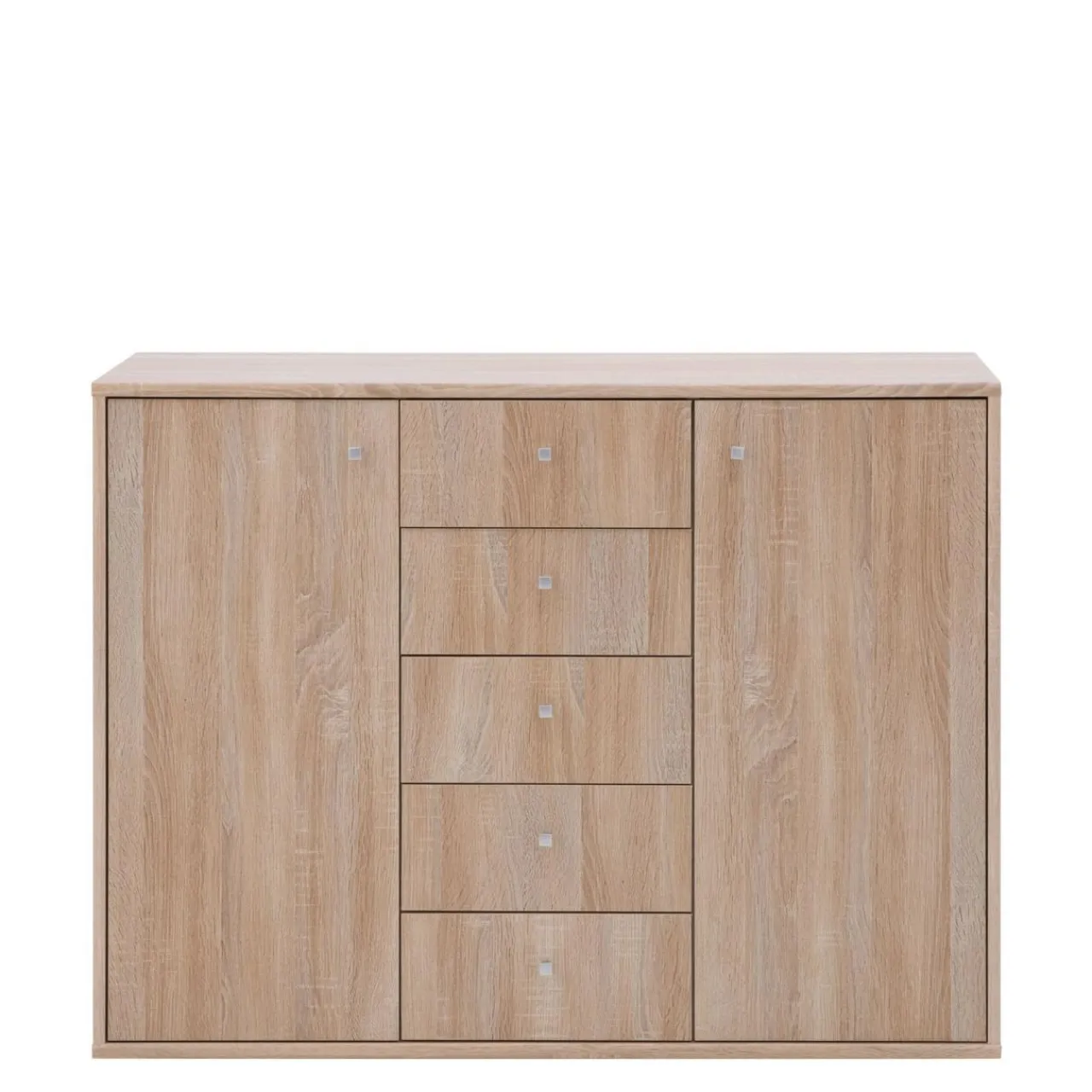 Komoda TEMPRA 2 posiada zamykane szafki z półkami oraz szuflady umiejscowione w centralnej części bryły. Została wykonana z płyty meblowej, pokrytej folią.