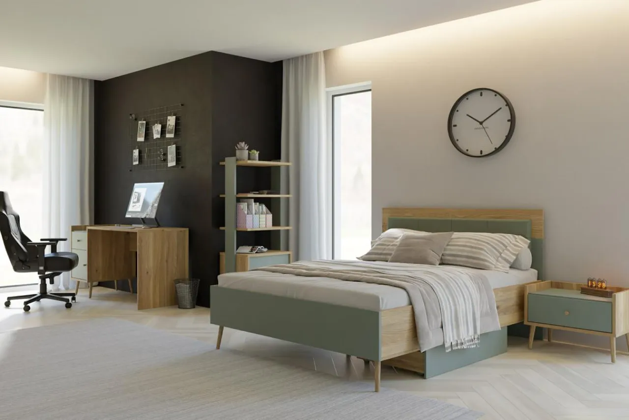 Jest trochę skandynawska, ale to, co ją wyróżnia to połączeniem barwy drewna z szałwiowym wykończeniem frontów i blatów. Kolekcja WHENUA zachwyca ciepłą kolorystyką i świeżym wyglądem. Pozwoli Ci zaaranżować modną sypialnię z motywem zielonych barw.