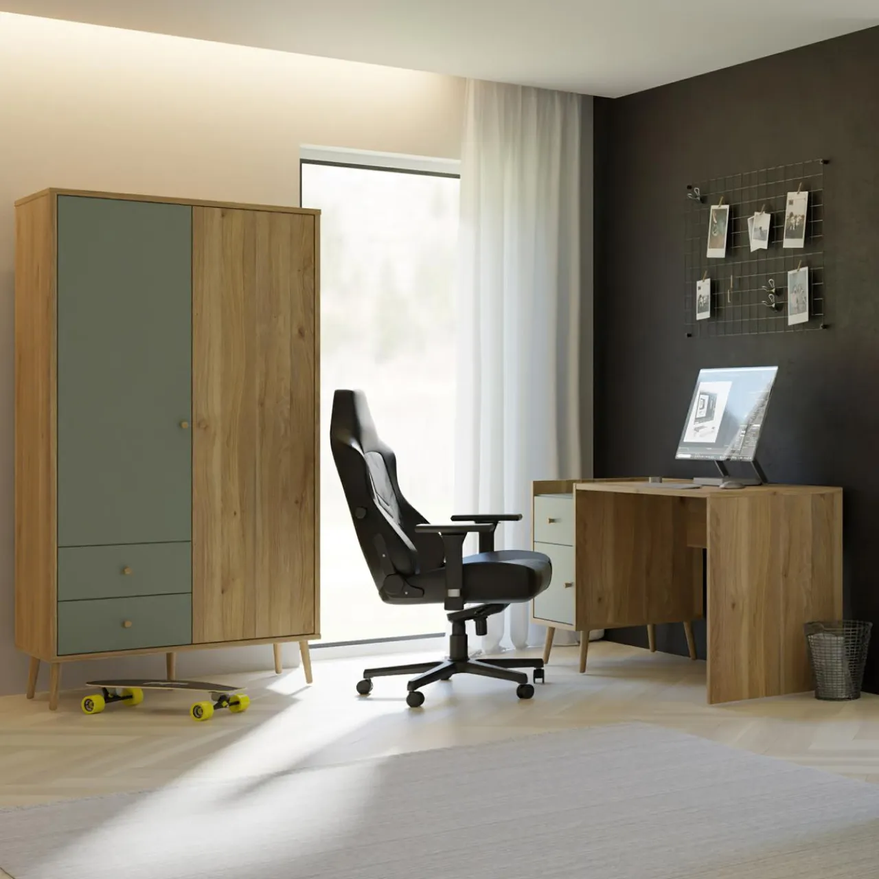 Jest trochę skandynawska, ale to, co ją wyróżnia, to połączeniem barwy drewna z szałwiowym wykończeniem frontów i blatów. Kolekcja WHENUA zachwyca ciepłą kolorystyką i świeżym wyglądem. Pozwoli Ci zaaranżować modny pokój młodzieżowy z motywem zielonych barw.