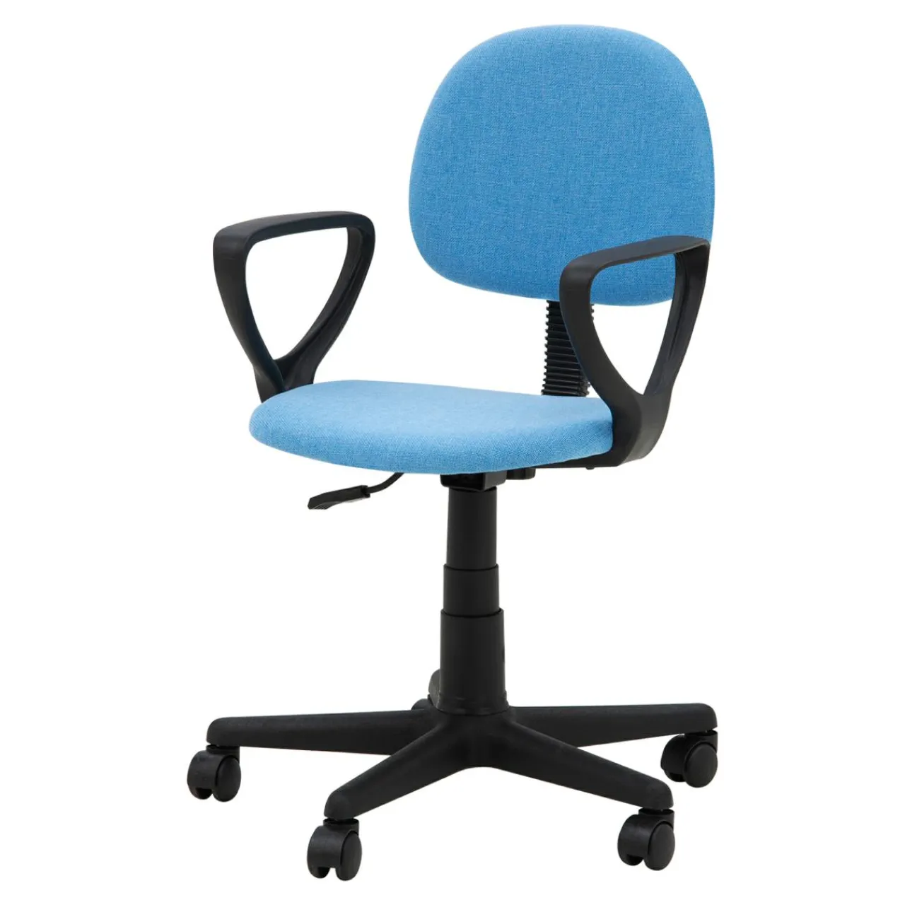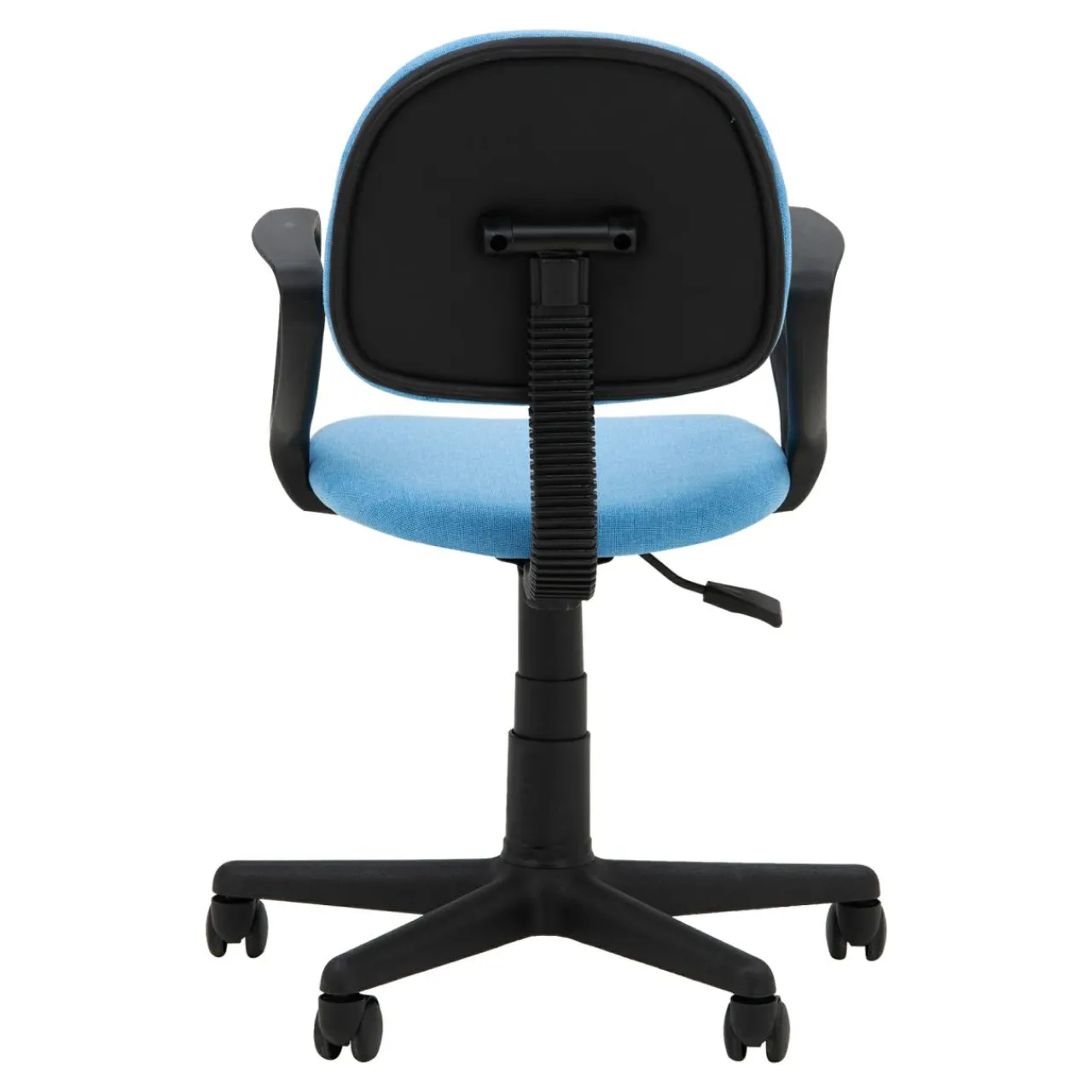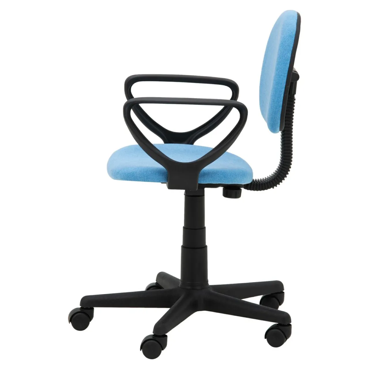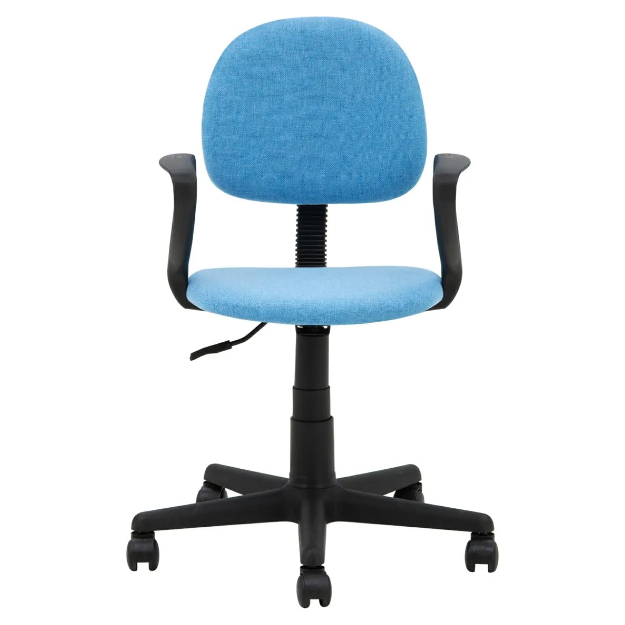 Wybierz fotel obrotowy NUPIG z jasnoniebieską tapicerką i czarną podstawą.