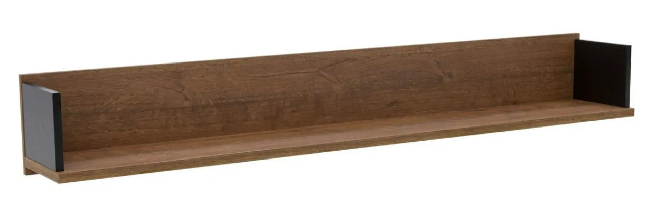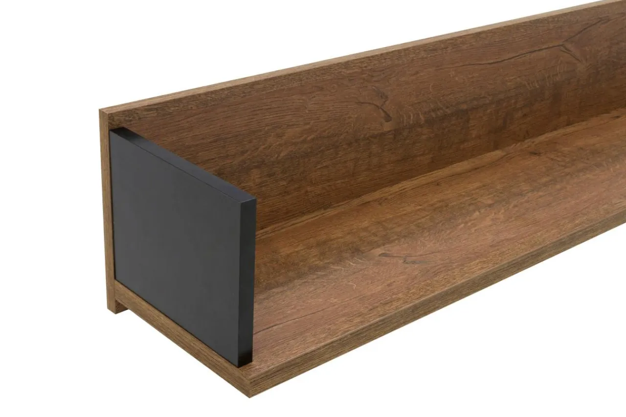 Kolorystyka półki w odcieniu dąb april została wzbogacona czarnymi wstawkami. To kontrastowe zestawienie sprawia, że cała kolekcja mebli DORIAN świetnie prezentuje się zarówno w jasnym, jak i ciemniejszym wnętrzu, oraz w zestawieniu z meblami utrzymanymi w nowoczesnej stylistyce.