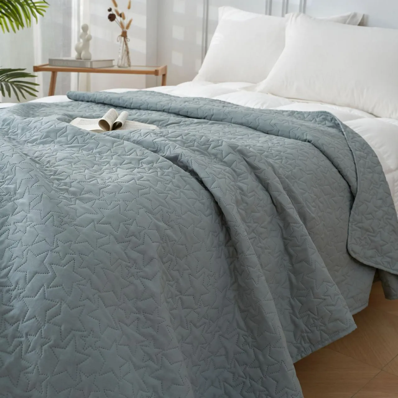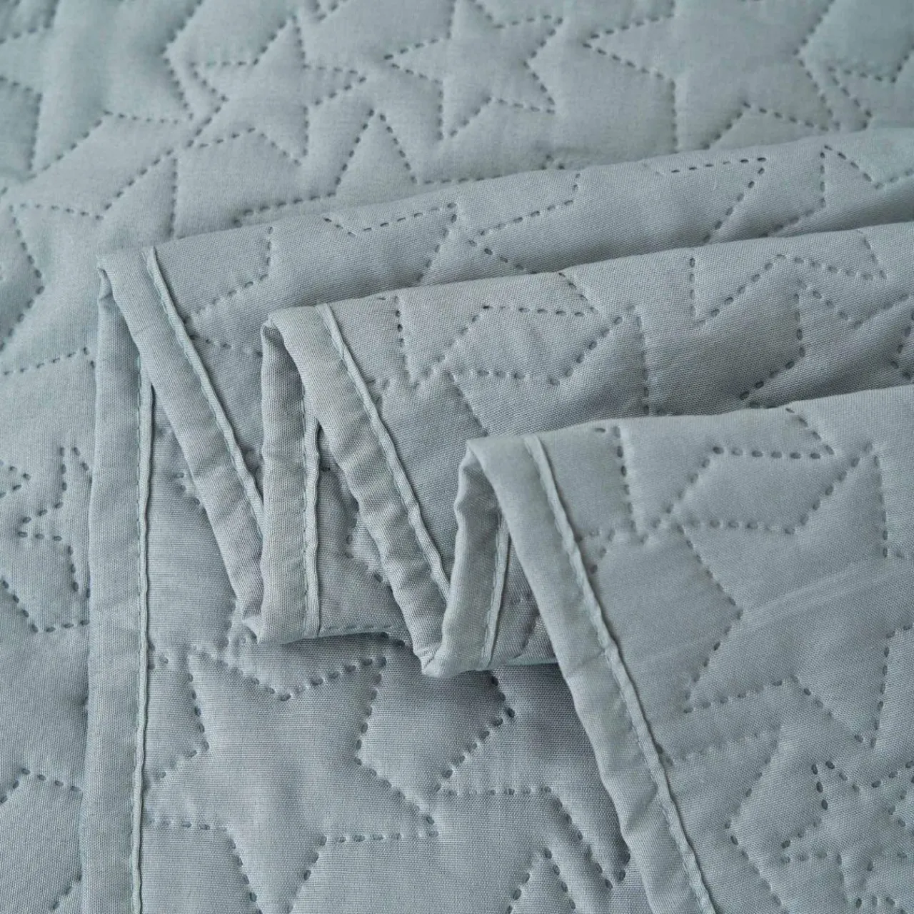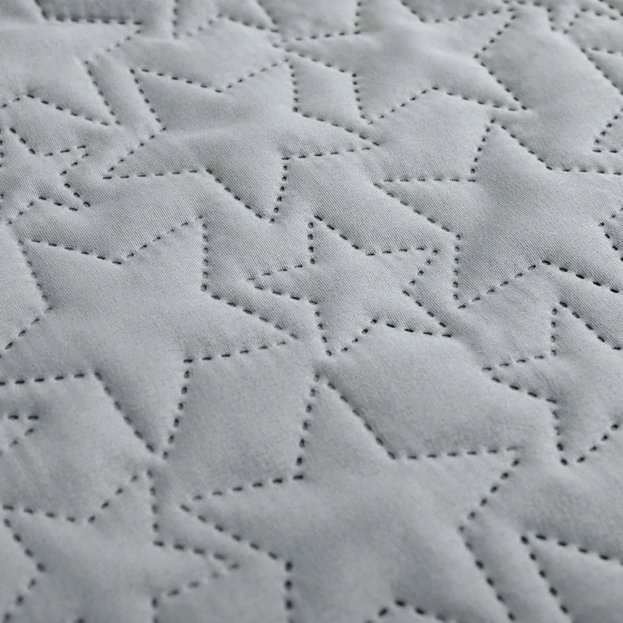 Jasnozielona narzuta na łóżko z kolekcji DABU zwróci uwagę wzorem w gwiazdy. Dekoracja doda wnętrzu przytulnego, relaksującego akcentu.