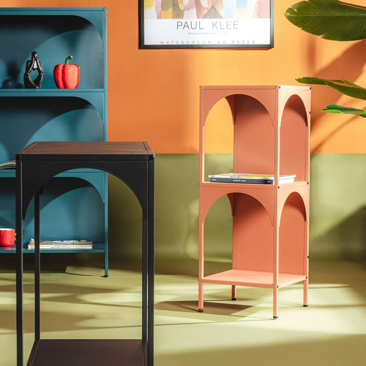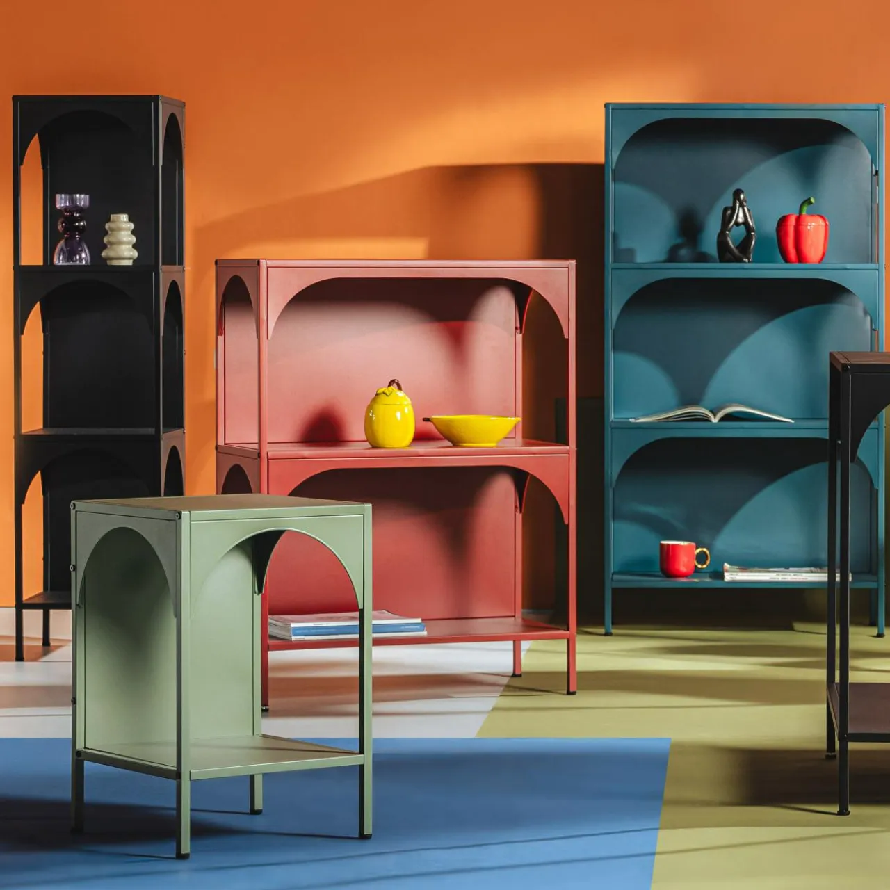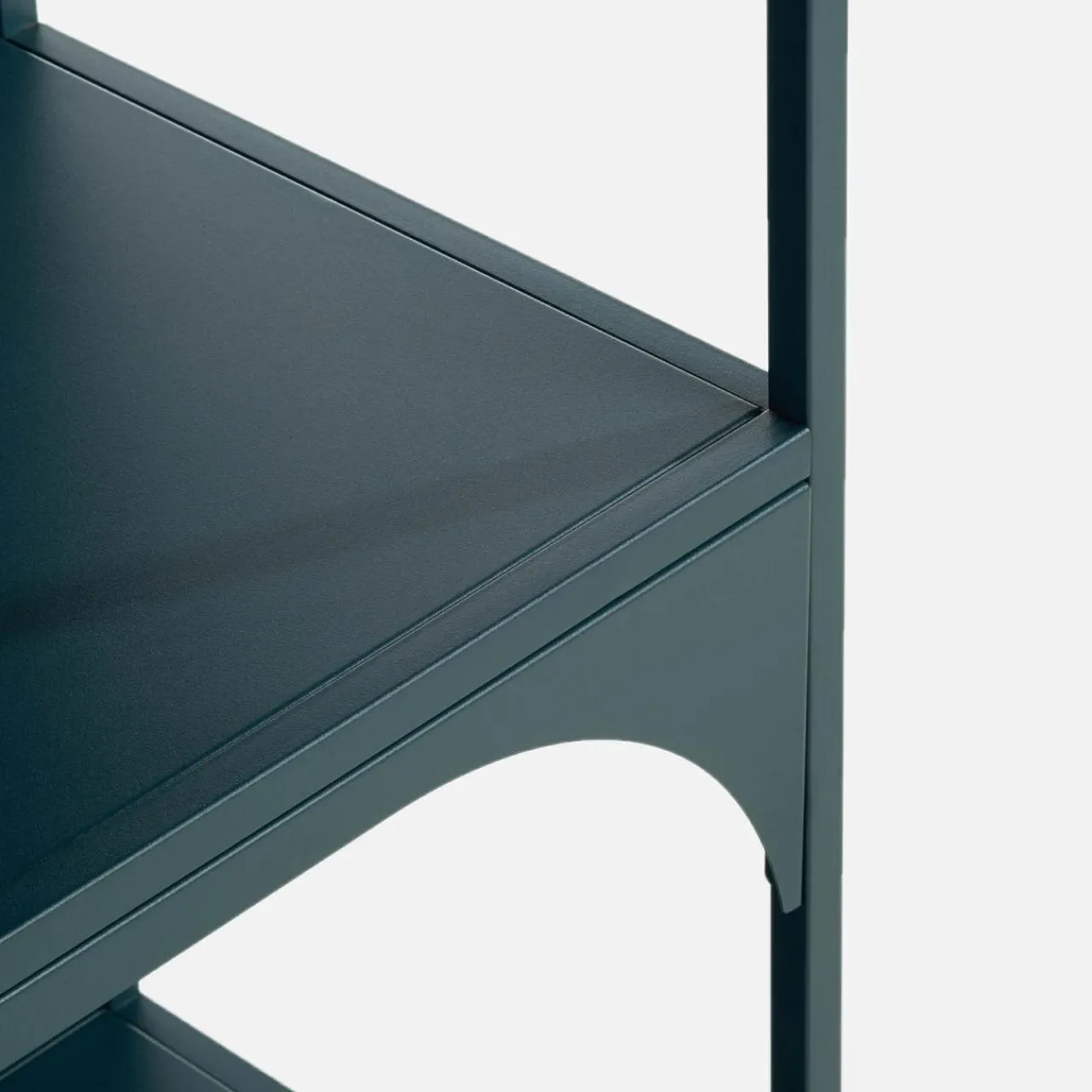 Regał HOCCA w niebieskim kolorze łączy industrialne akcenty z nowoczesnym designem, tworząc elegancką i funkcjonalną przestrzeń do przechowywania.