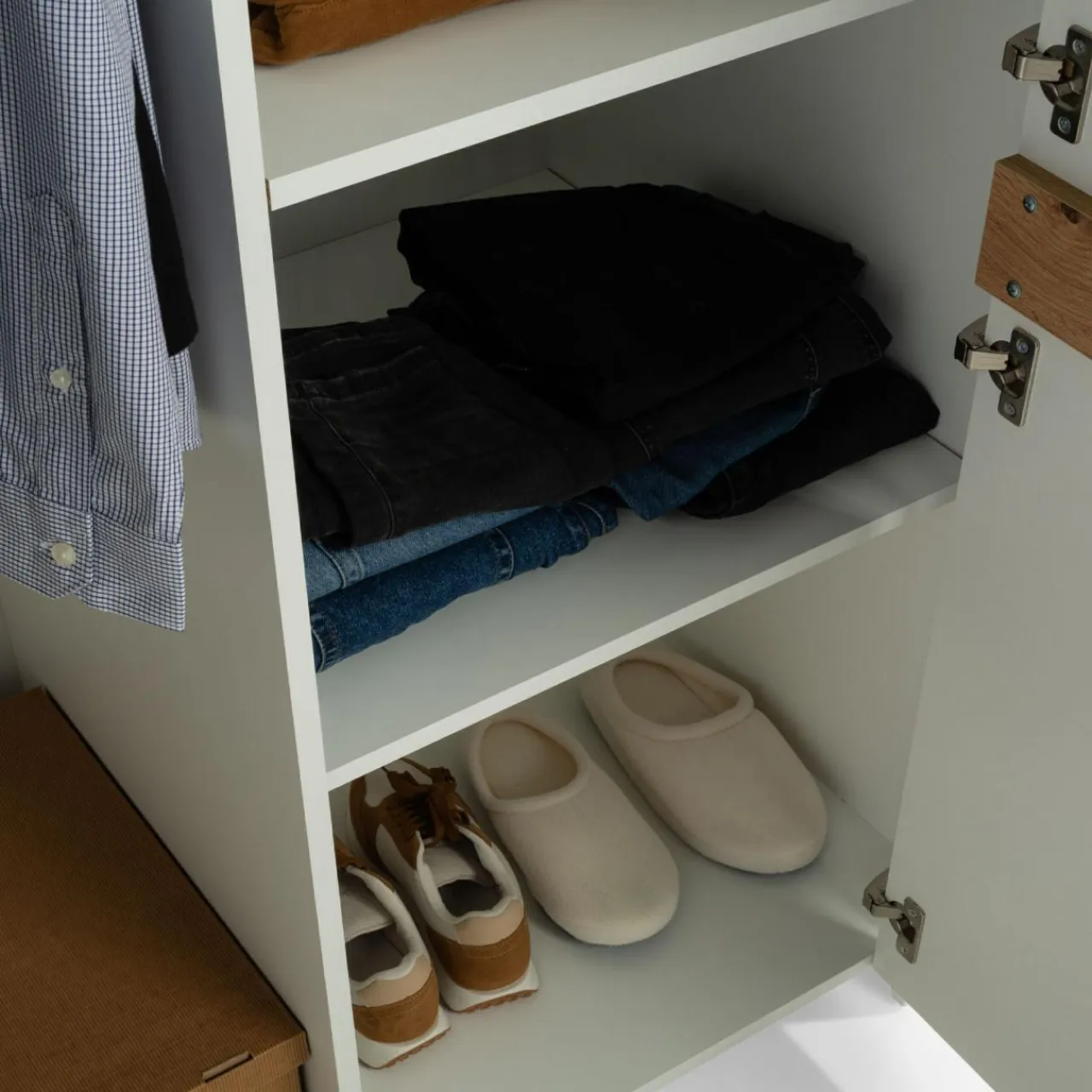 - Niepozorne miejsce na pudełka z butami — dno szafy to świetne miejsce na przechowanie potrzebnego opakowania obuwia.