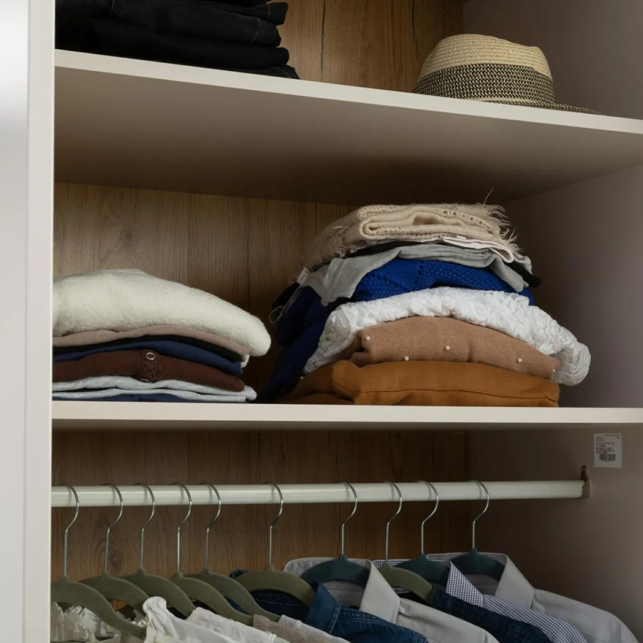 - Drążek na wieszaki — pomieścisz na nim delikatne części garderoby podatne na pogniecenie lub płaszcze i kurtki.