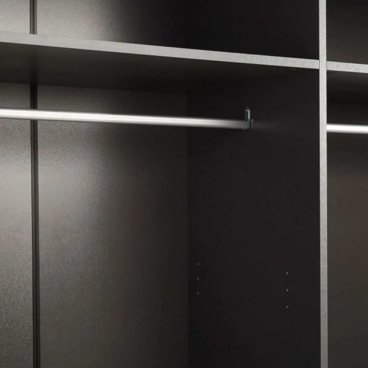 Szafa METROPOLITAN posiada w środku 2 drążki na ubrania oraz 4 półki. Dzięki takiemu układowi oddzielisz swoją odzież od partnera lub sezonową od aktualnie noszonej.