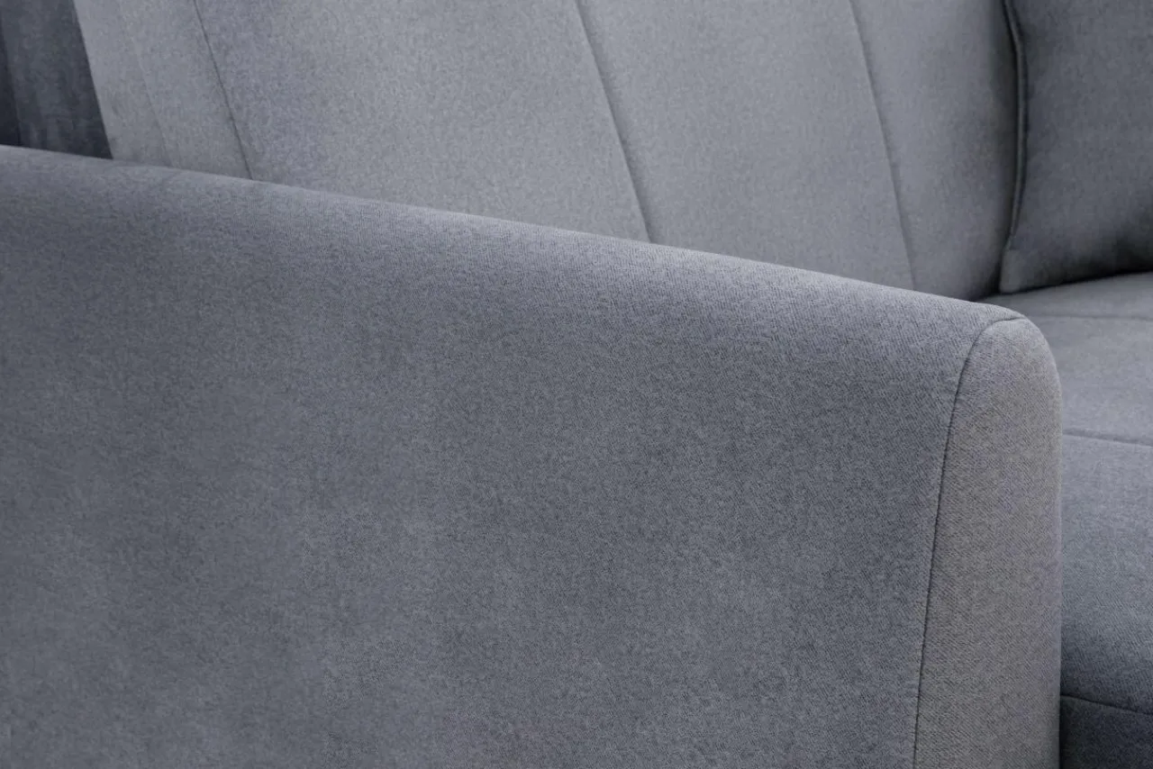 Sofa DALIA została wykończona tkaniną ELEMENT w szarym odcieniu. Posiada właściwości trudnopalne i wodoodporne.