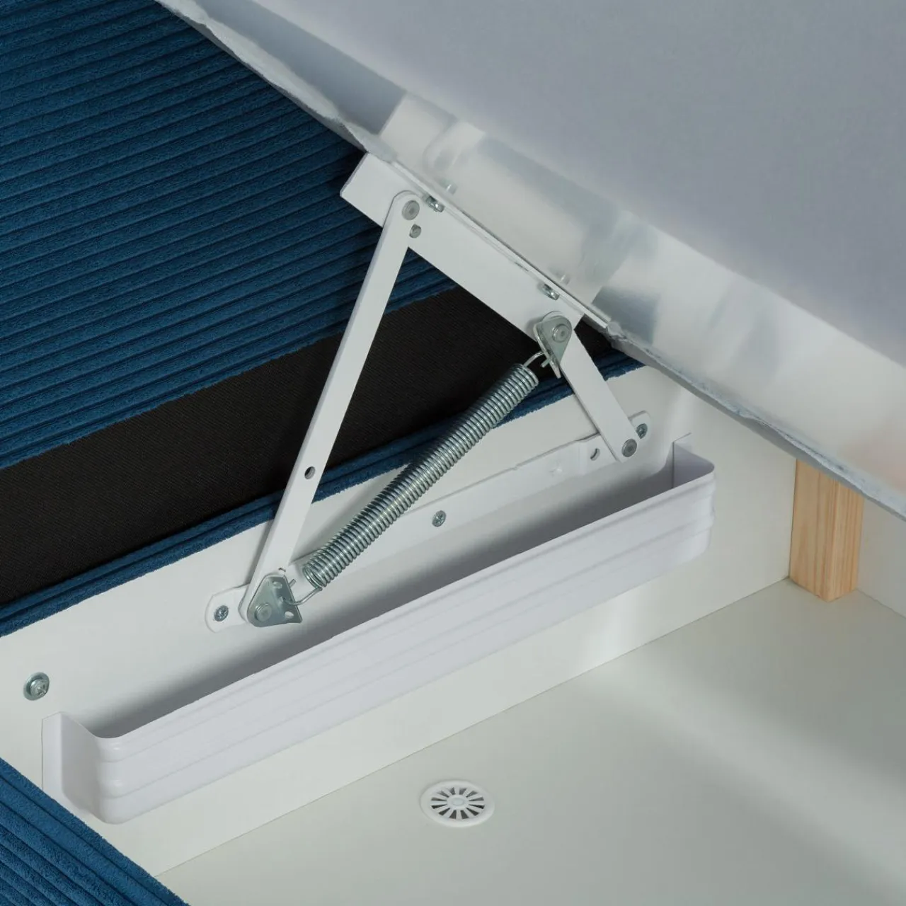 - Tapczan OPEN posiada pod siedziskiem pojemnik na pościel, do którego możesz schować poduszkę, pościel i prześcieradło.