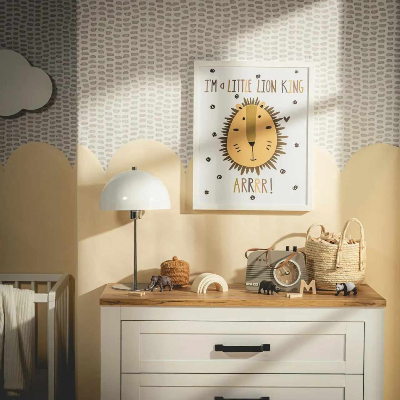 Obraz dla dziecka LION o wymiarach 40×50 cm będzie ładnie wyglądał przy jasnych lub drewnianych meblach. Możesz go też powiesić nad stoliczkiem, przy którym Twoje dziecko lubi się bawić. Obraz z uśmiechniętym lwem pomoże stworzyć przytulną atmosferę.