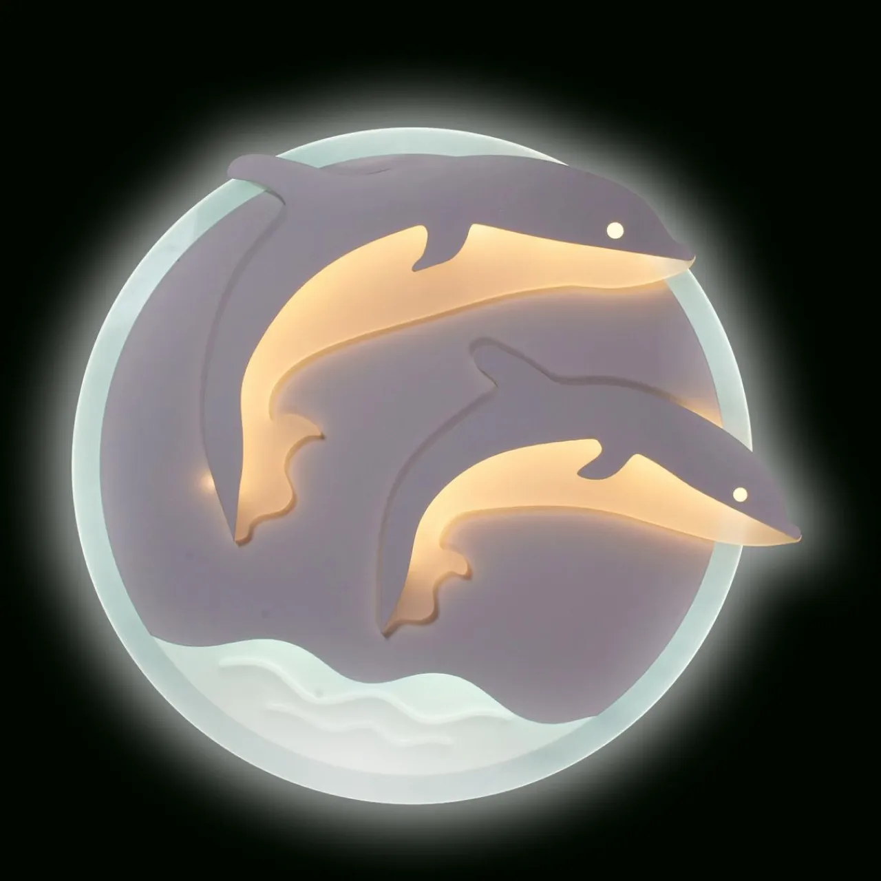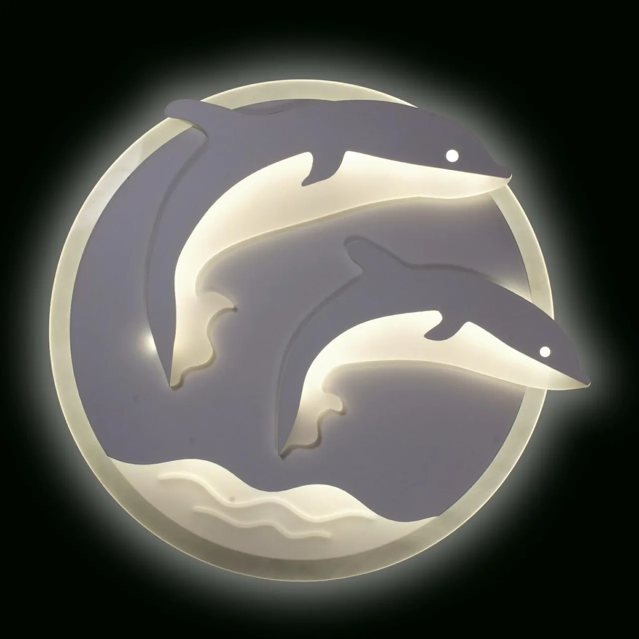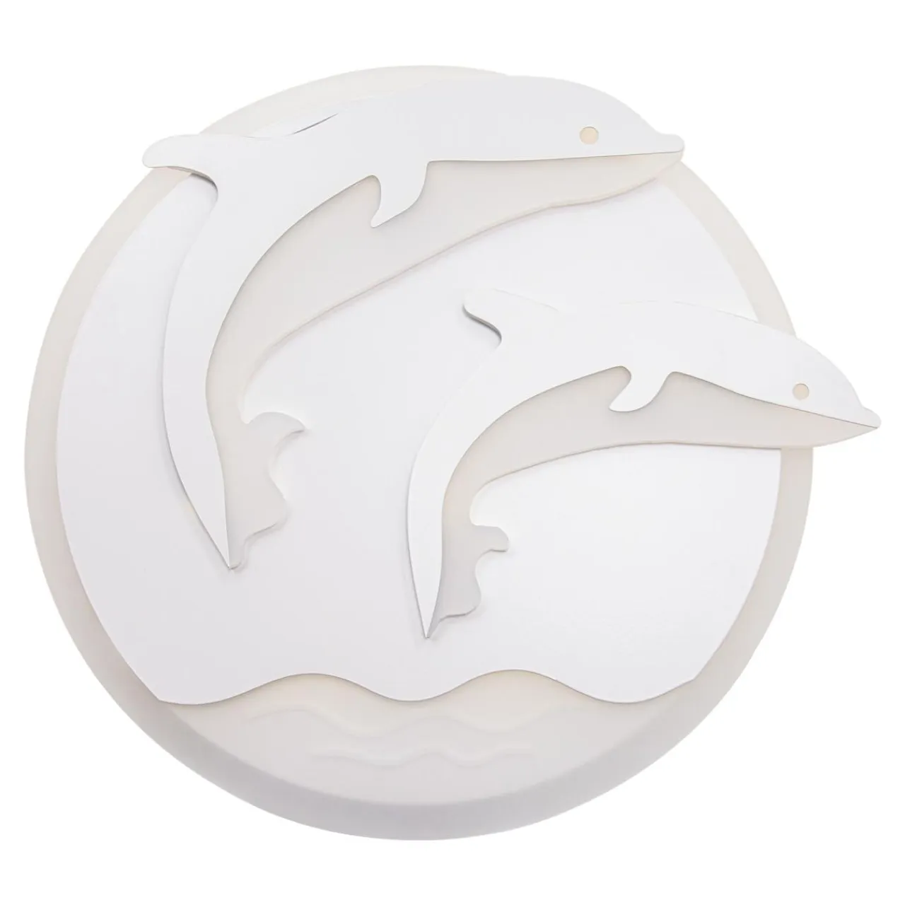 - okrągły plafon przedstawia delfiny wyskakujące z fal oceanu