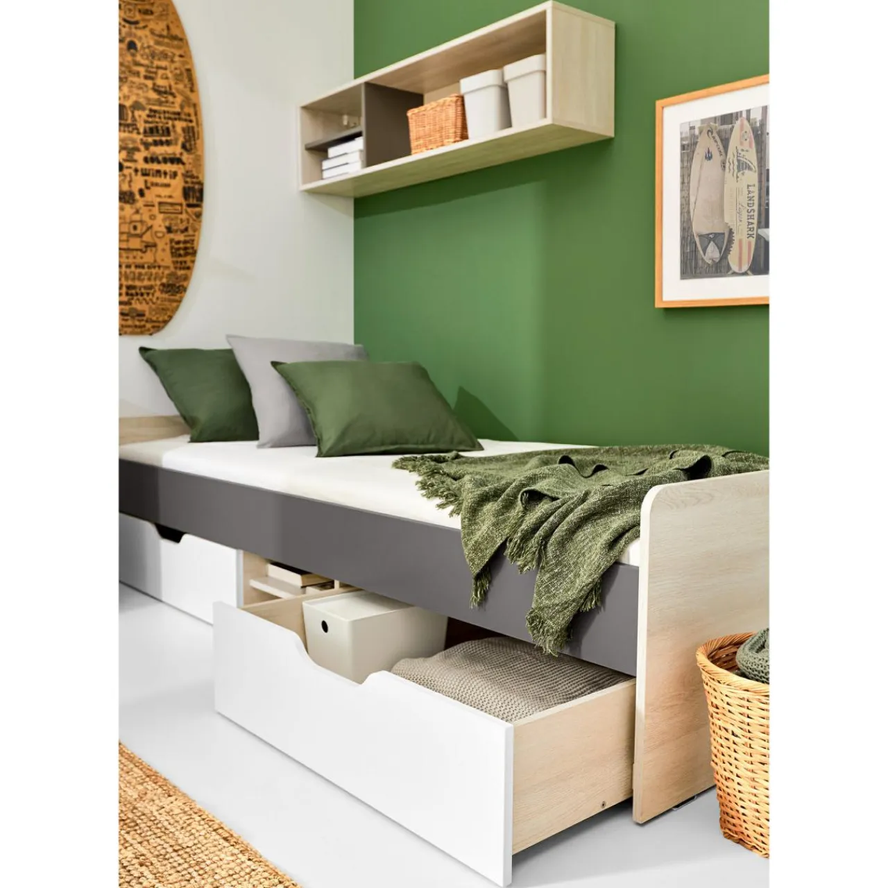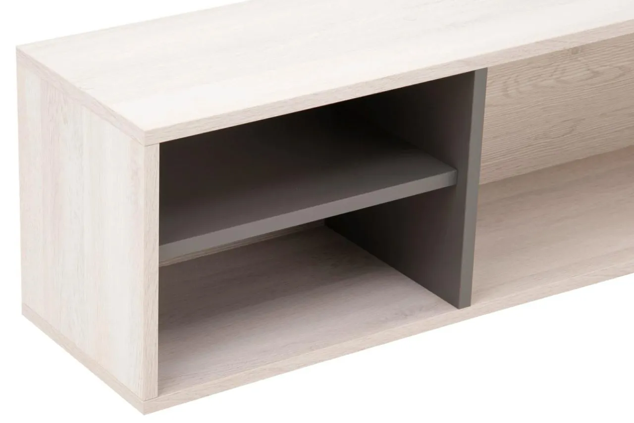 - Powierzchnię mebla pokryto laminatami w kolorach: białego dębu wilton i szarym.