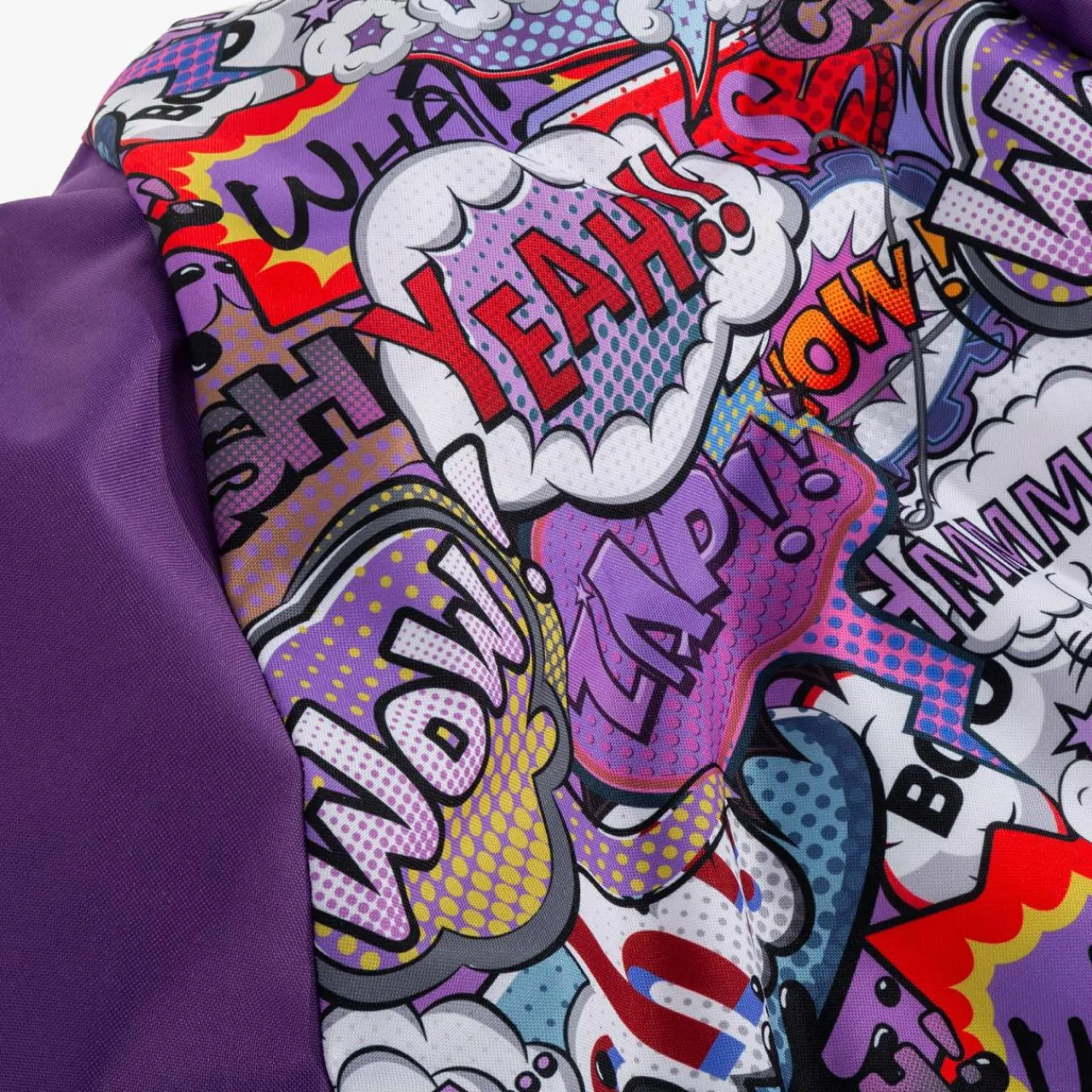 Fioletowy puf z komiksowym wzorem zapewni efekt „wow” w aranżacji pokoju nastolatka.