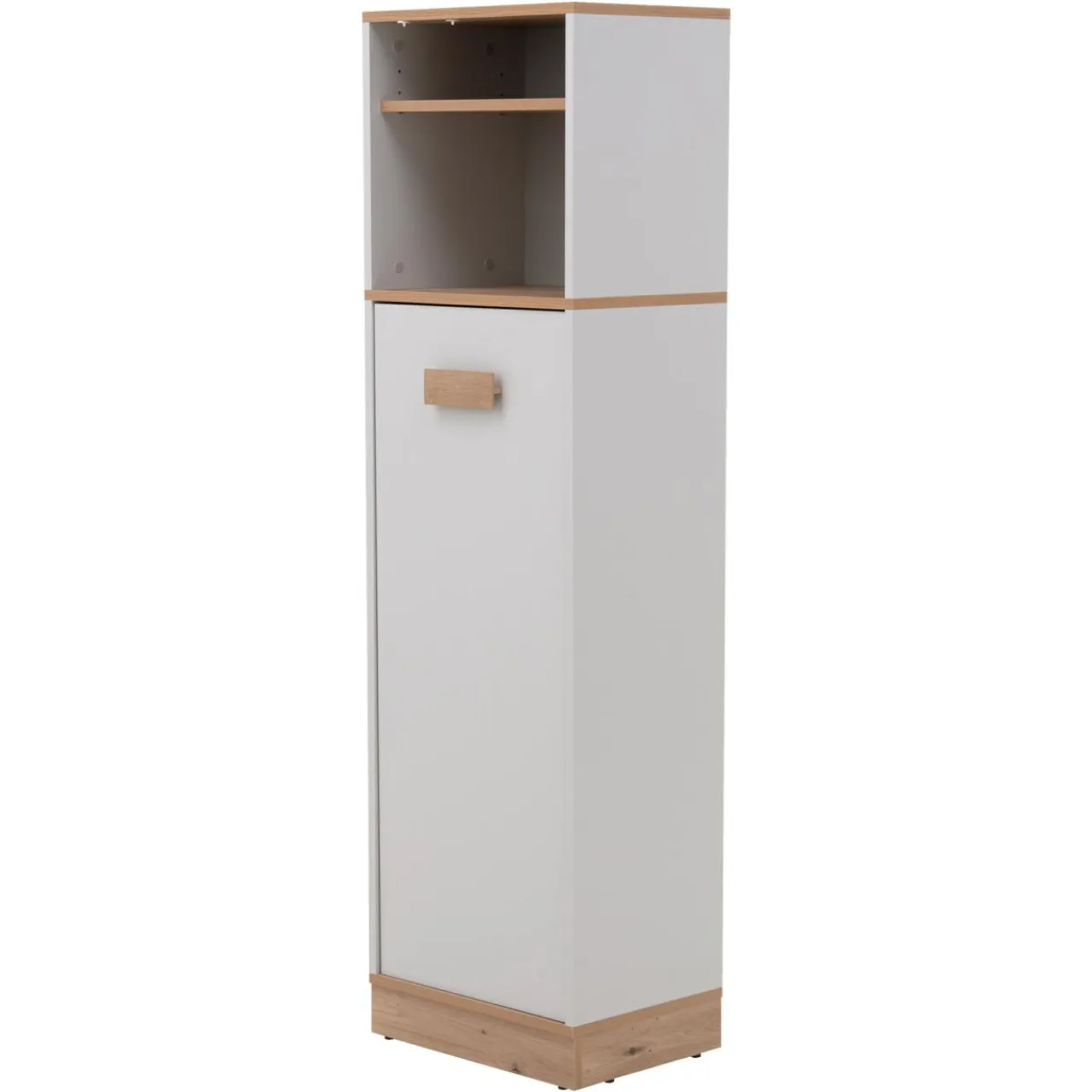 Dzięki zamykanej szafce i otwartej półce zapewnia zarówno funkcjonalność, jak i wyeksponowania ulubionych rzeczy.