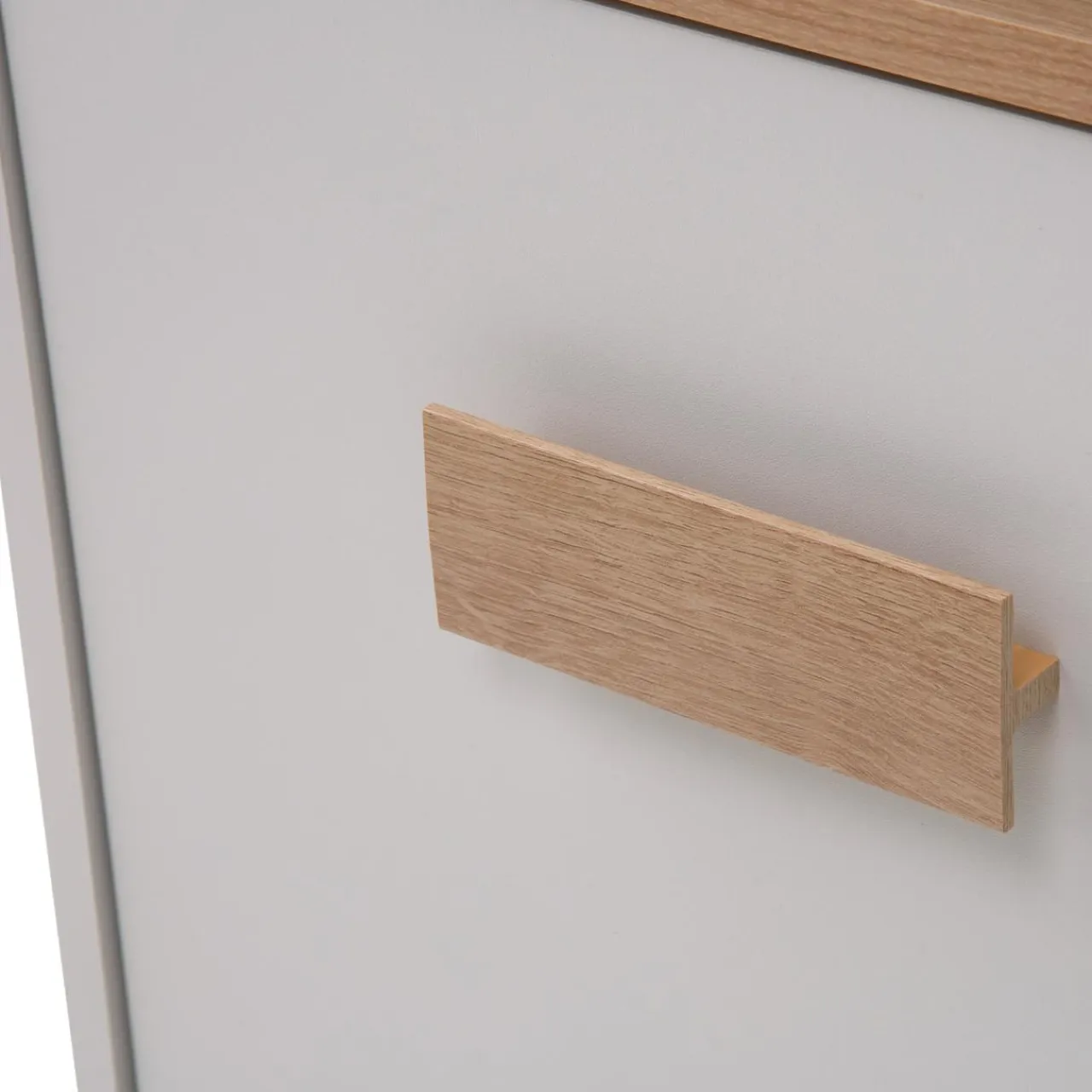 - Korpusy i fronty wykonane są z laminowanej płyty meblowej o grubości 16 mm.Meble mają jasnoszary kolor. Mocno oświetlone porannymi promieniami sprawią wrażenie białych. W cieniu będą sprawiać wrażenie szarych.