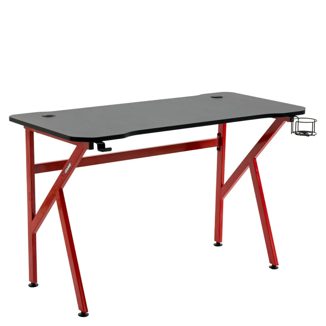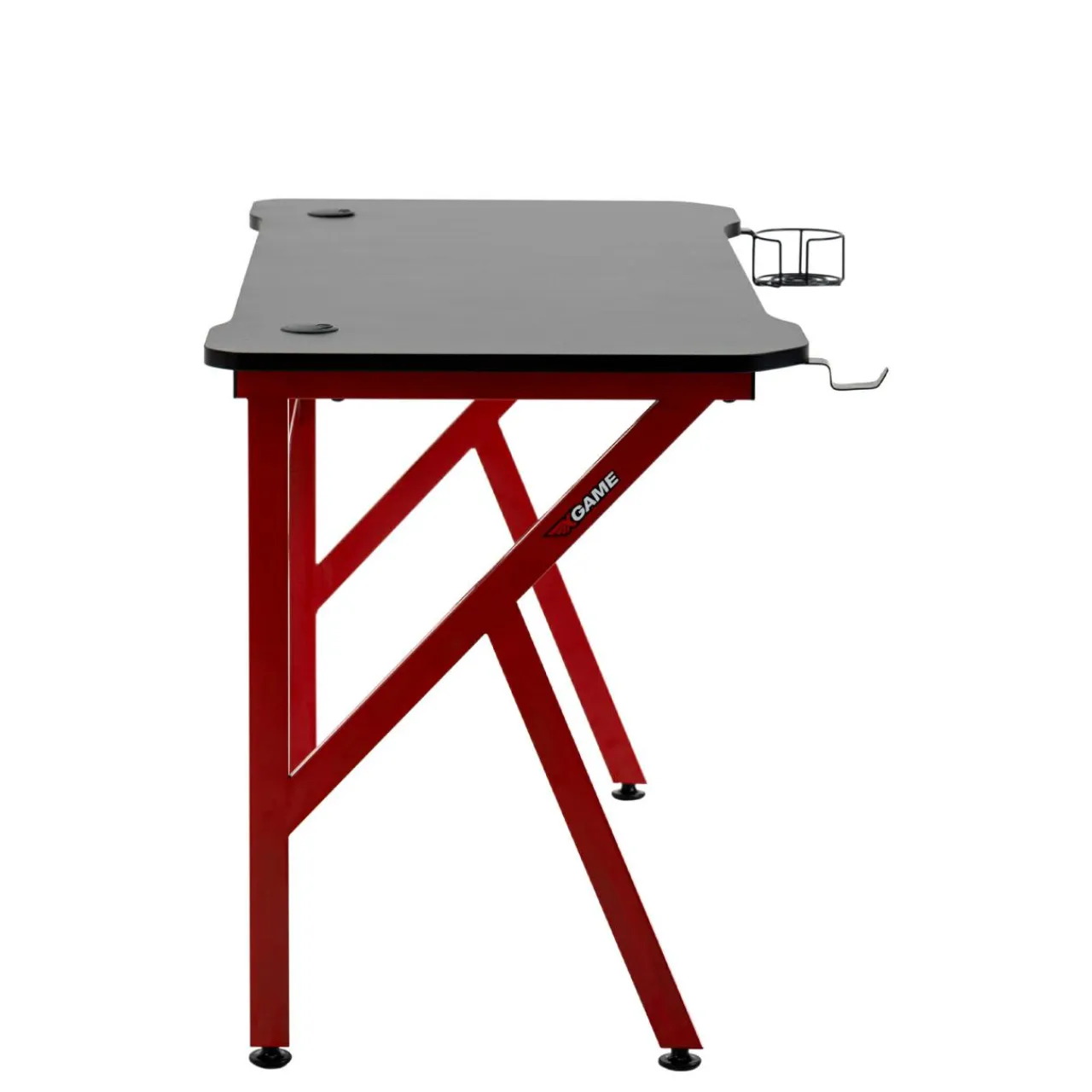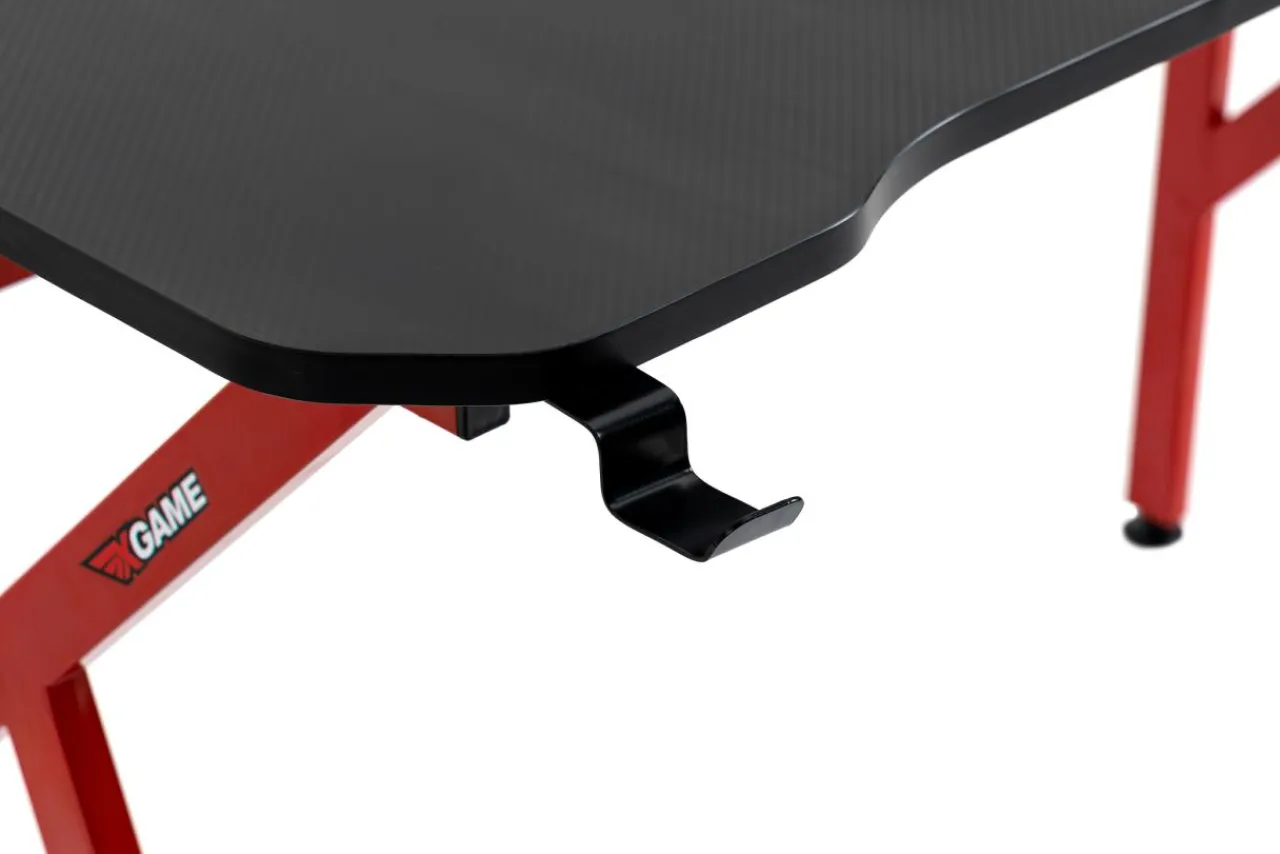 - Podstawą biurka są metalowe nogi. Taka konstrukcja zapewnia dużo miejsca pod blatem, a czerwone wykończenie tworzy nowoczesny kontrast z blatem i urozmaica pomieszczenie.