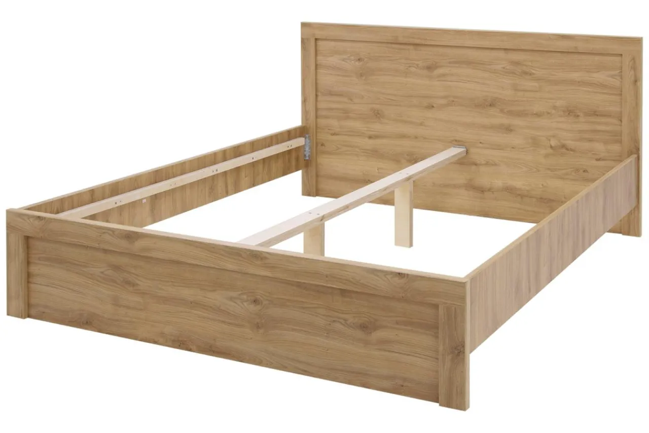 - Korpus i rama łóżka wykonane są z płyty meblowej w kolorze jasnego drewna.