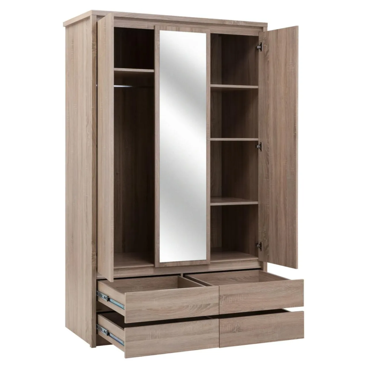 Trzydrzwiowa szafa z lustrem Norton charakteryzuje się prostą minimalistyczną formą, która sprawia, że mebel pasuje do nowoczesnych wnętrz. Laminat w jasnym kolorze dębu sonoma dekorem przypominający drewno wprowadzi w pomieszczeniu przytulny klimat. Brak tradycyjnych uchwytów sprawia, że mebel łatwiej wkomponować w dowolną aranżację.