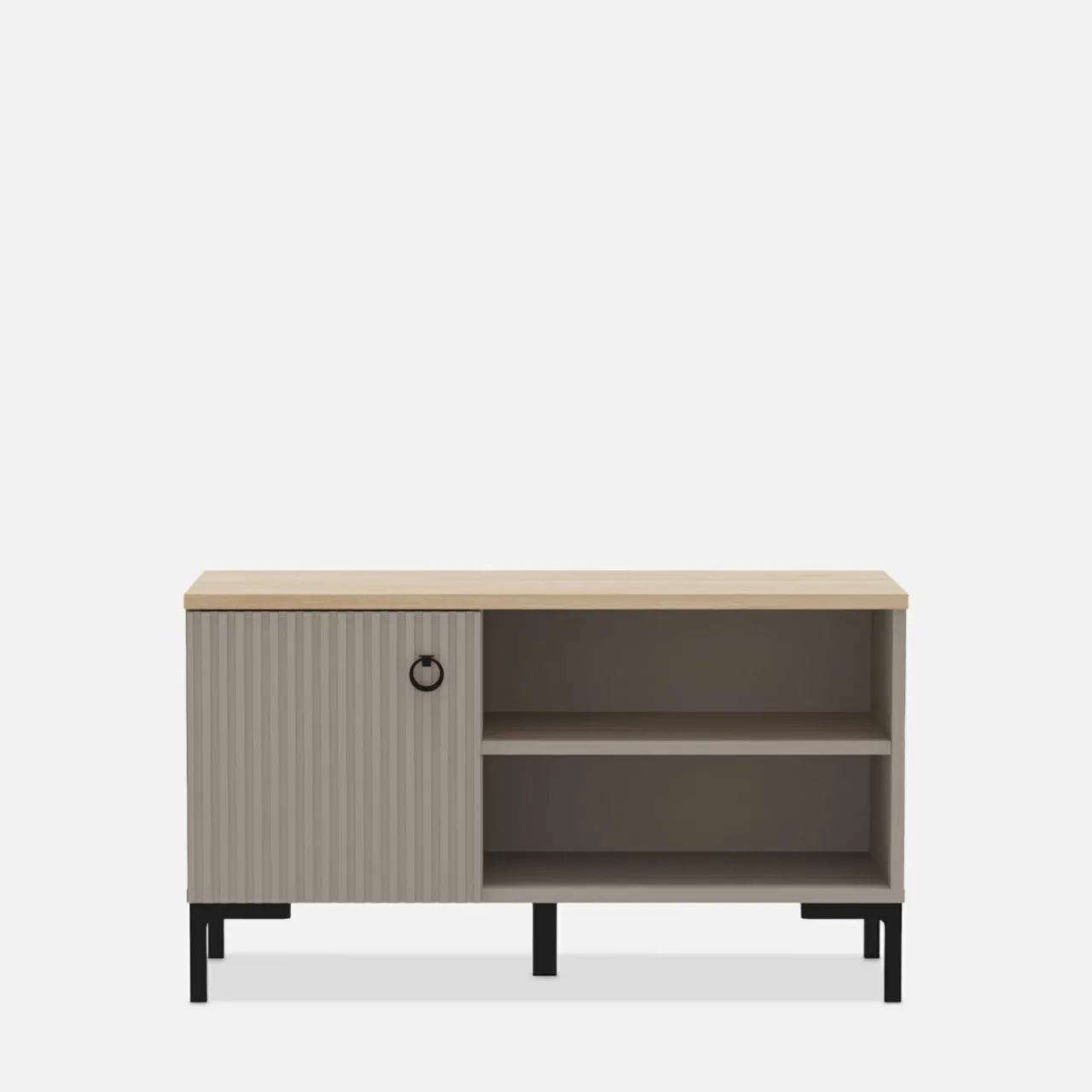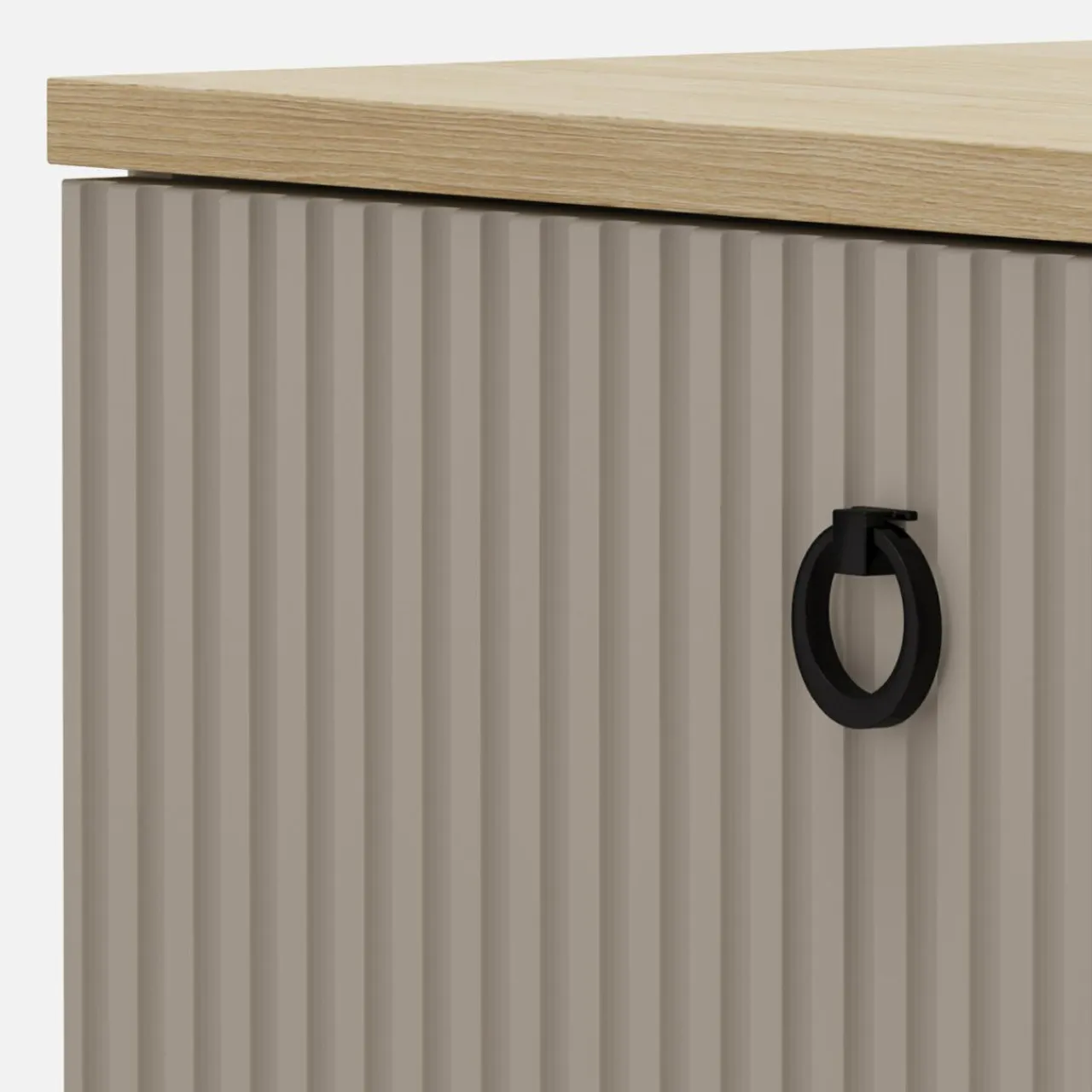 - Ryflowane fronty w kolorze taupe idealnie zgrywają się z korpusami. Wykończone są laminatem i folią.