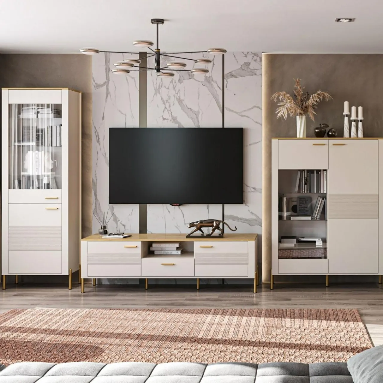 - W szafkach bocznych schowaj dodatkowe akcesoria — pady do grania, płyty czy piloty. Schowane nie zaburzą codziennego porządku w pokoju dziennym.