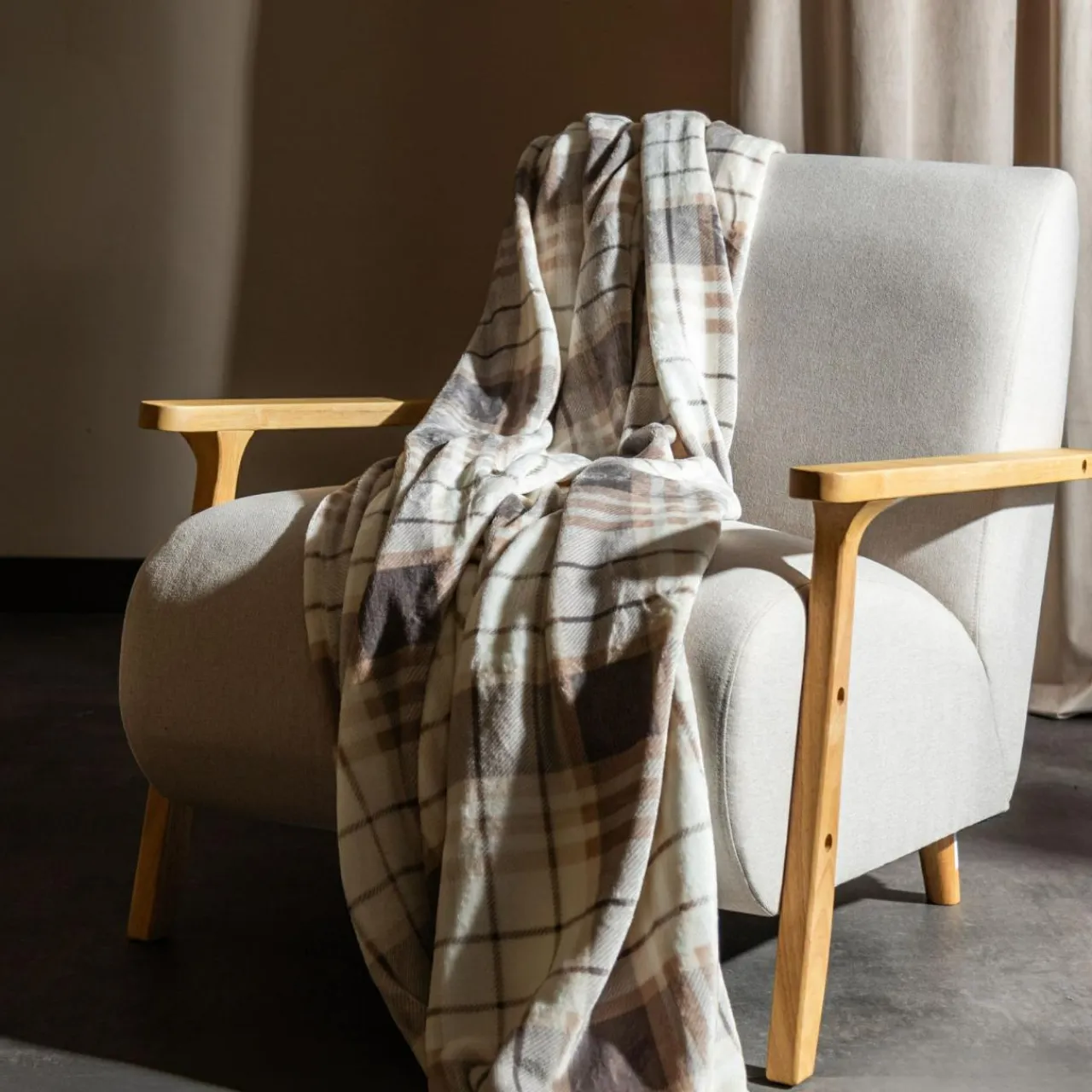 Wzór w szkocką kratę będzie pasować do wielu aranżacji. Beż będzie spójnie wyglądać na tle jasnej sofy.
