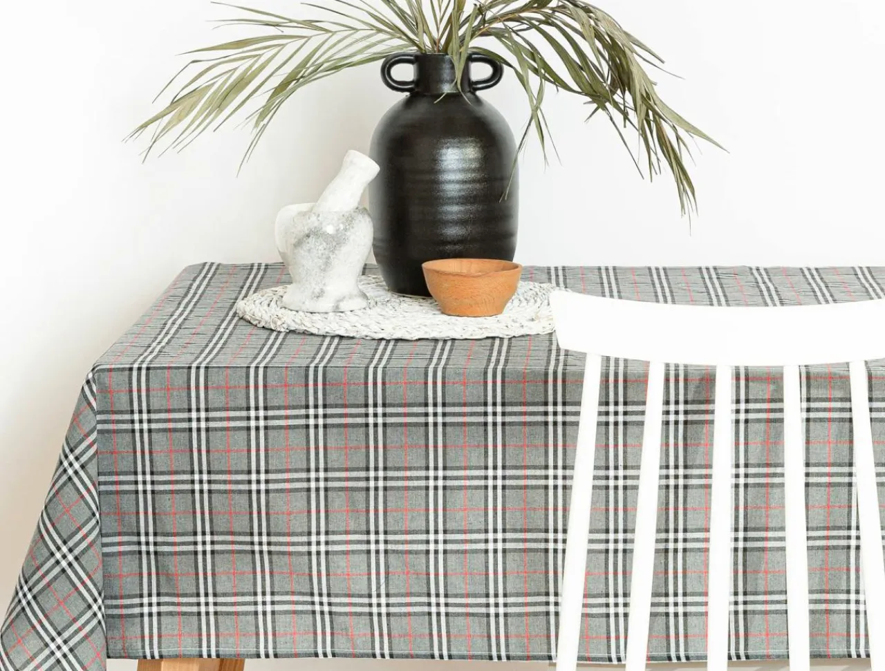 Stół w swoim salonie lub jadalni udekoruj obrusem z wzorem szarej, szkockiej kraty.