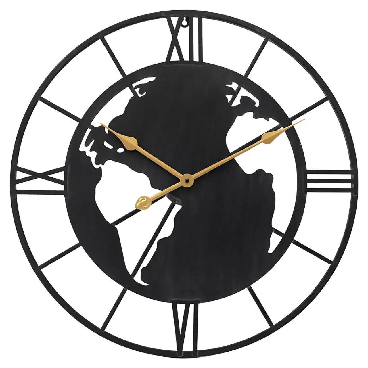 Czarny, metalowy zegar z motywem kuli ziemskiej będzie doskonale widoczny na tle jednolitej, jasnej ściany. To bardzo efektowny dodatek, który zwraca na siebie uwagę. Szczególnie spodoba się miłośnikom podróży i ozdabiania domu pamiątkami z wojaży.