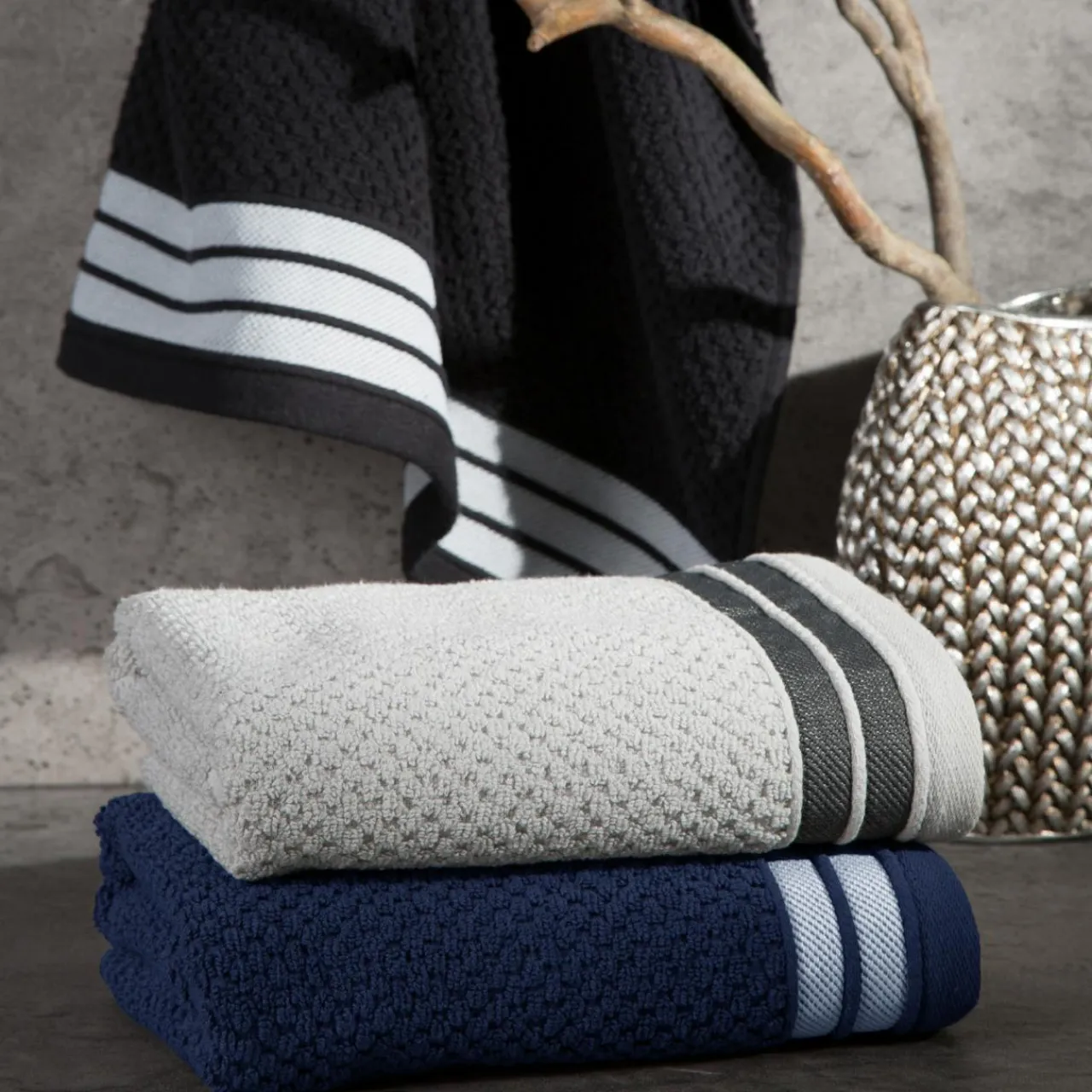 - W kolekcji znajdziesz także srebrne ręczniki w rozmiarach: 50×90 cm i 70×140 cm.