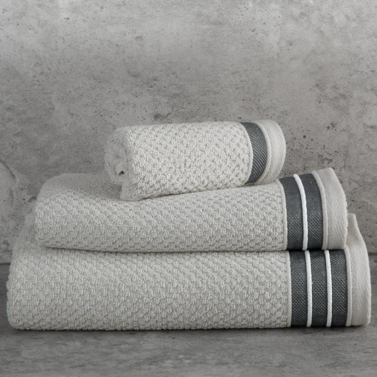 Srebrny ręcznik z kolekcji MADLEN podkreśli nowoczesna aranżację łazienki. Ryżowa struktura w połączeniu z ozdobną bordiurą nadaje mu oryginalny i elegancki wygląd.