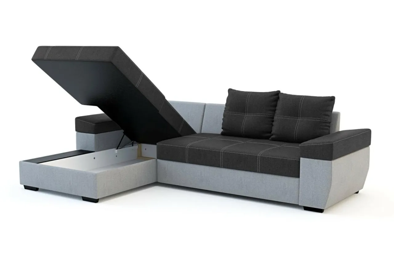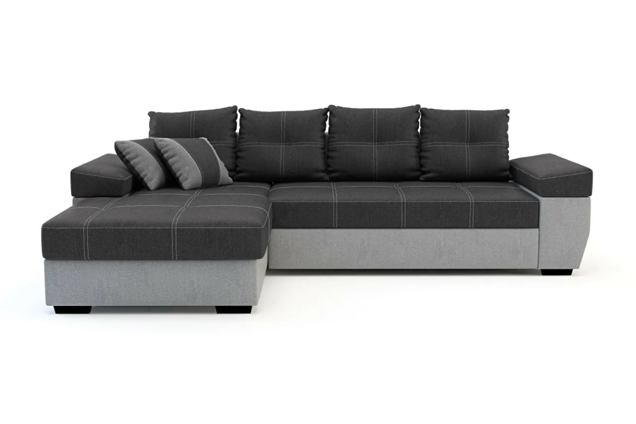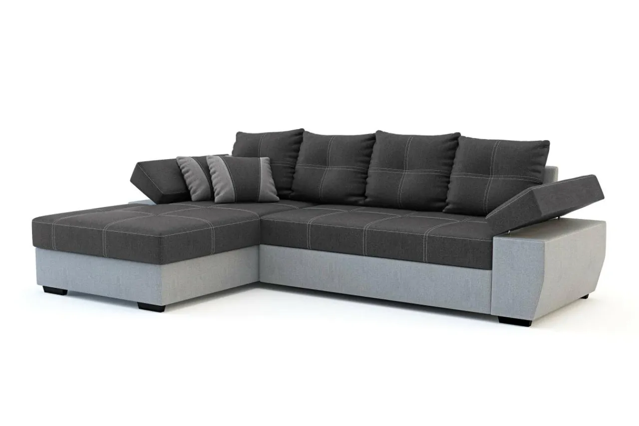 Rozłożysty narożnik LARGO to dobry wybór do obszernego salonu. Nowoczesny styl mebla i ciekawe kontrastowe przeszycia pozwolą każdego dnia cieszyć się wspaniałym wnętrzem i sprawić, że mebel będzie zwracał na siebie uwagę. Tapicerka w ciemnej i jasnej szarości z kontrastowymi nićmi na siedzisku i poduszkach oraz dwoma poduszkami dekoracyjnymi to charakterystyczna cecha tego modelu.