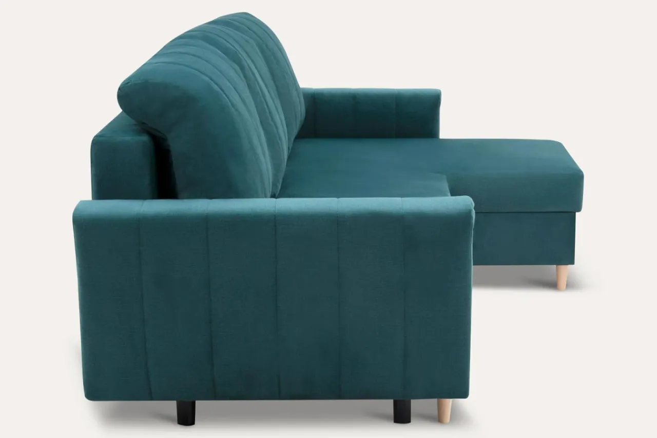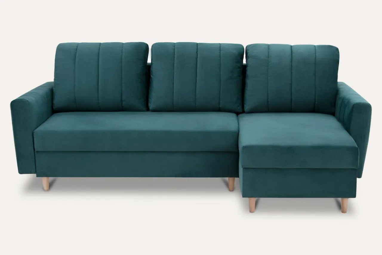 Narożnik w odcieniu koloru zielonego pomoże stworzyć elegancki i reprezentacyjny kącik wypoczynkowy.