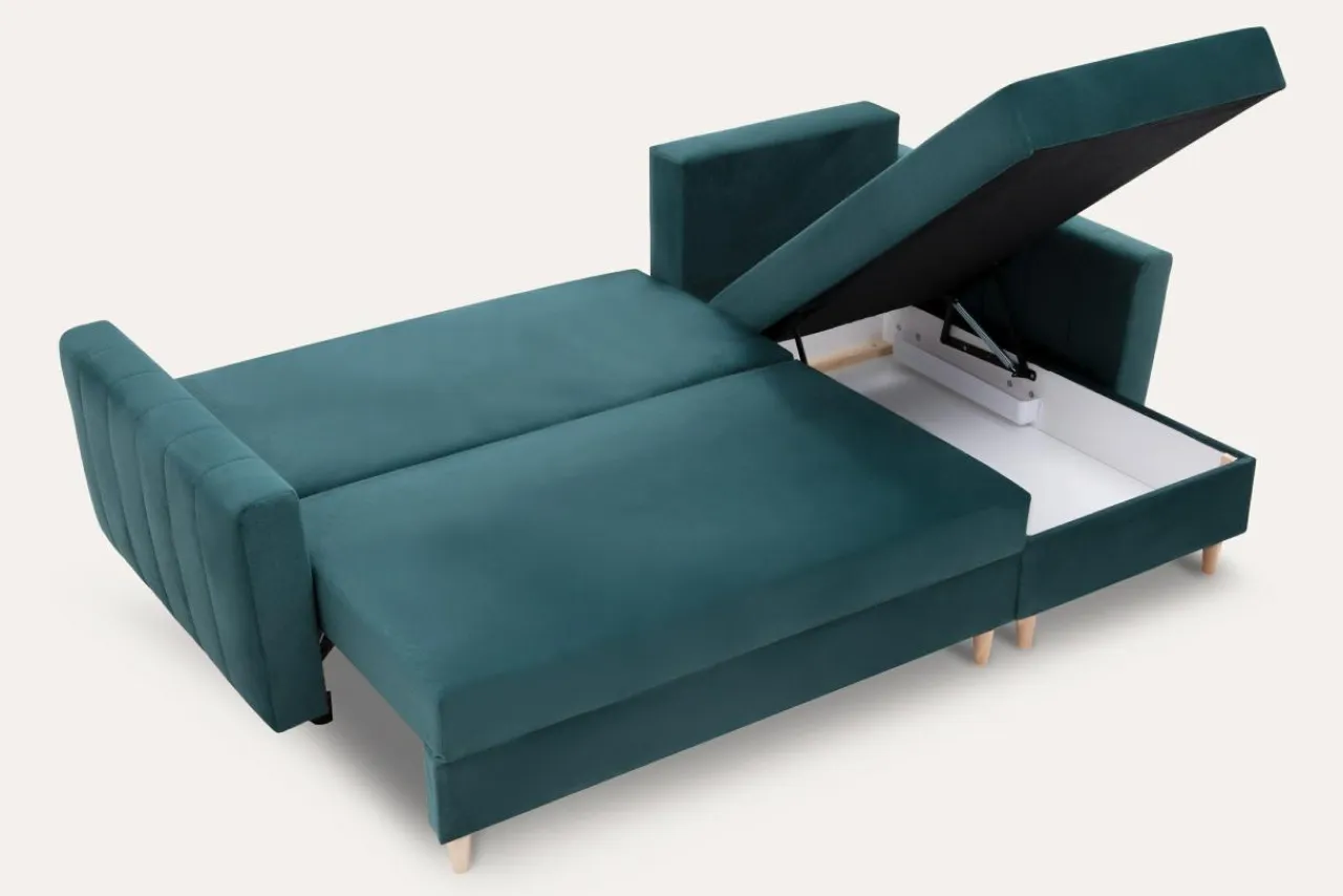 - W otomanie oraz pod siedziskiem znajdują się 2 pojemniki na pościel, który przyda się na przechowanie posłania.