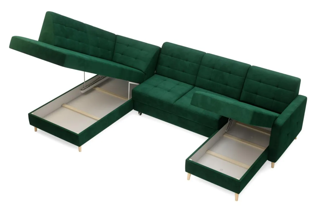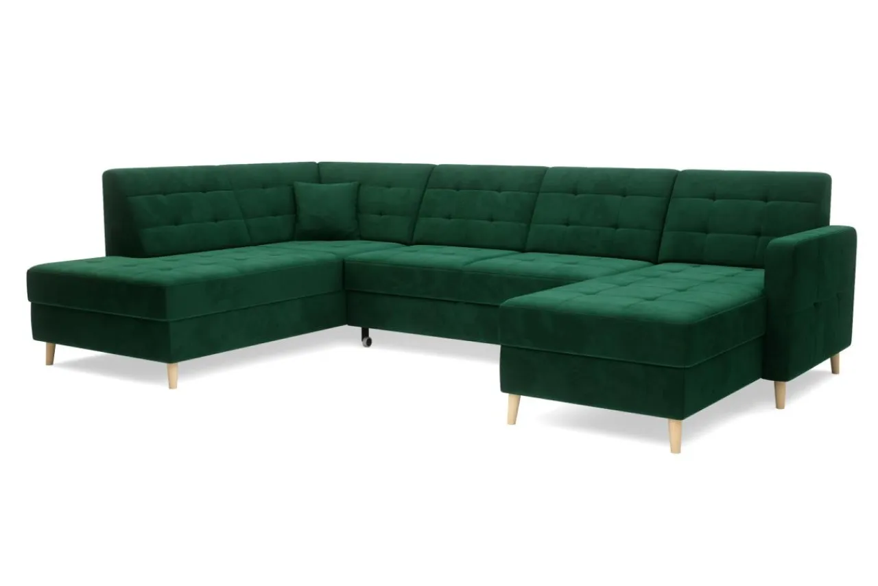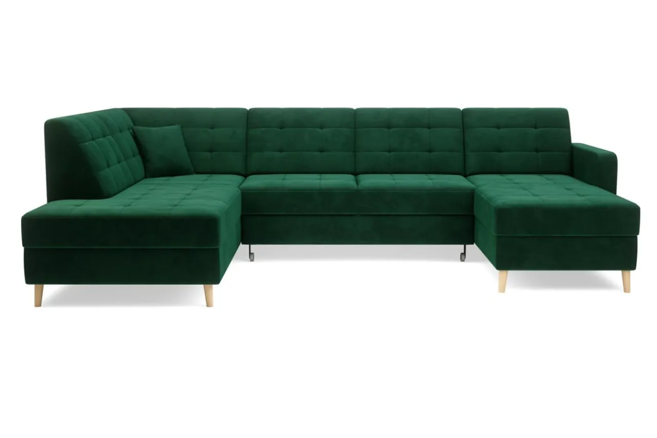 Welurowa tkanina RIVIERA użyta do obicia mebla jest bardzo przyjemna w dotyku i mało podatna na ścieranie. Wysokie nóżki wykonane są z bukowego drewna zabezpieczonego lakierem.