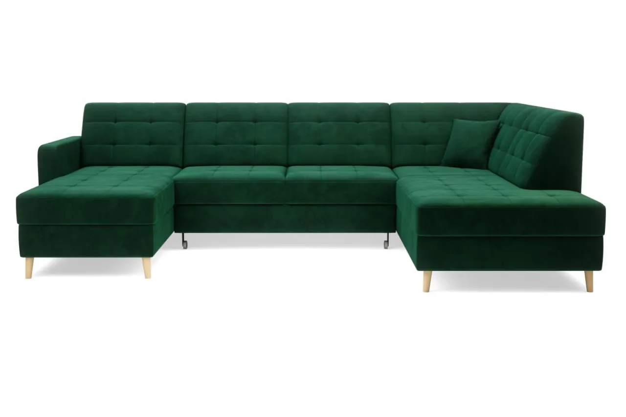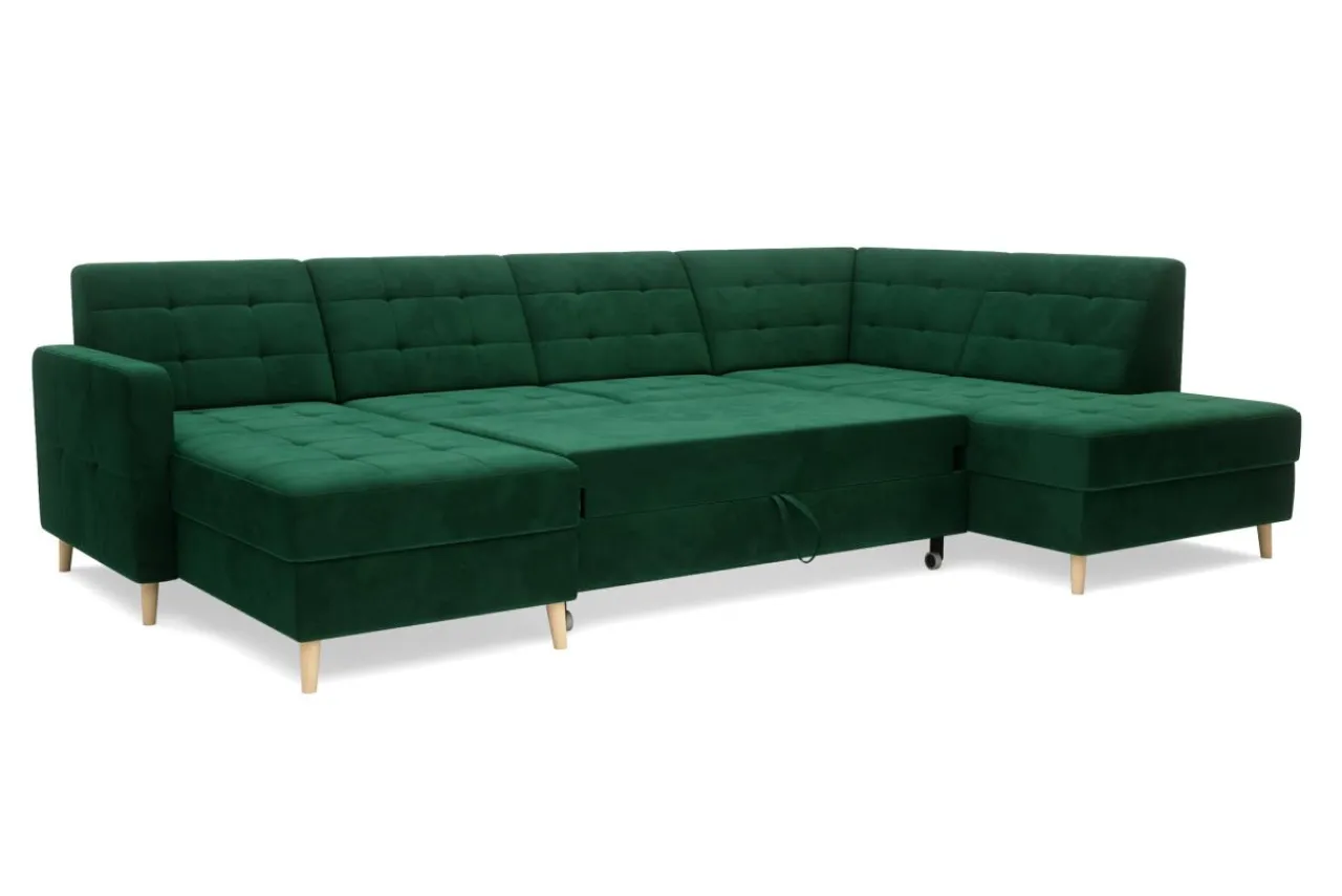 Welurowa tkanina RIVIERA użyta do obicia mebla jest bardzo przyjemna w dotyku i mało podatna na ścieranie. Wysokie nóżki wykonane są z bukowego drewna zabezpieczonego lakierem.