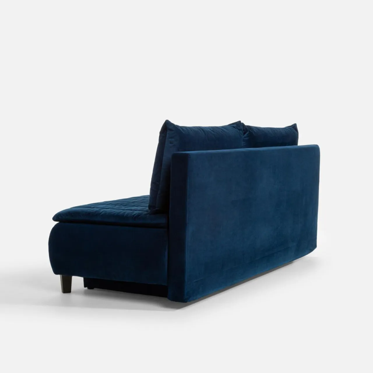 Sofa zachwyca welurową tkaniną o pięknym, granatowym odcieniu, która doskonale wpisuje się w najnowsze trendy wnętrzarskie. Elementem dekoracyjnym są pionowe przeszycia, które w elegancki sposób podkreślają nowoczesny charakter mebla. Możesz wkomponować ją we wnętrza z motywem morskiej głębi. Połyskująca powierzchnia tapicerki koresponduje z dodatkami w stylu glamour.