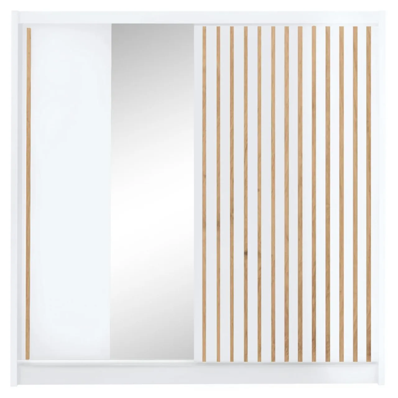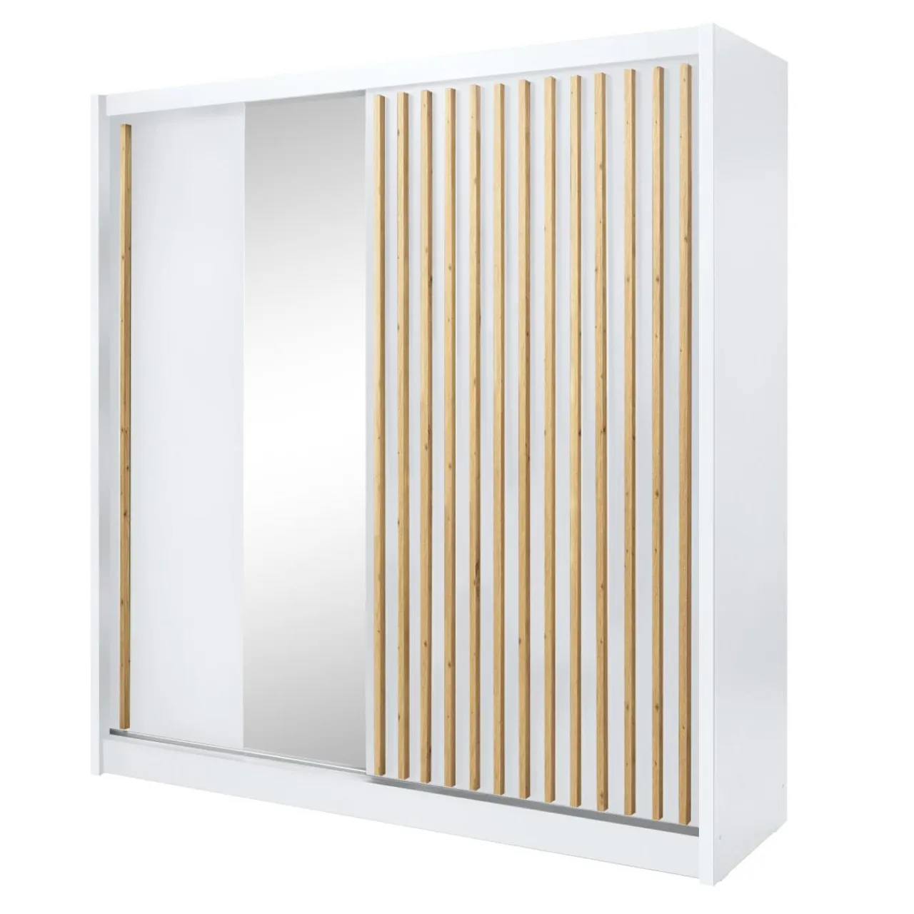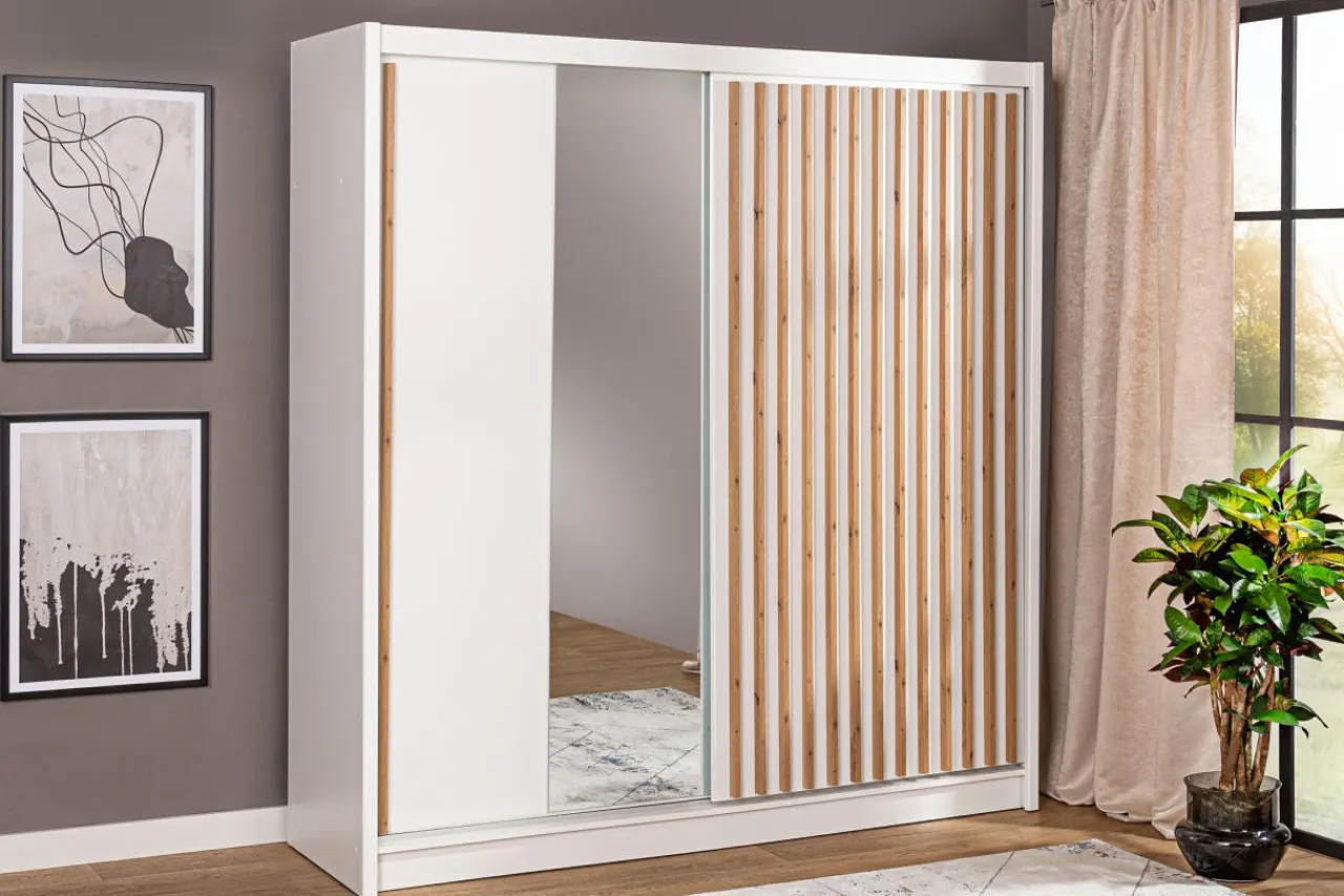 Szafa biała z lamelami i lustrem LAMELLO to mebel, który idealnie dopełni wnętrza urządzone w stylu minimalistycznym, skandynawskim lub japandi.