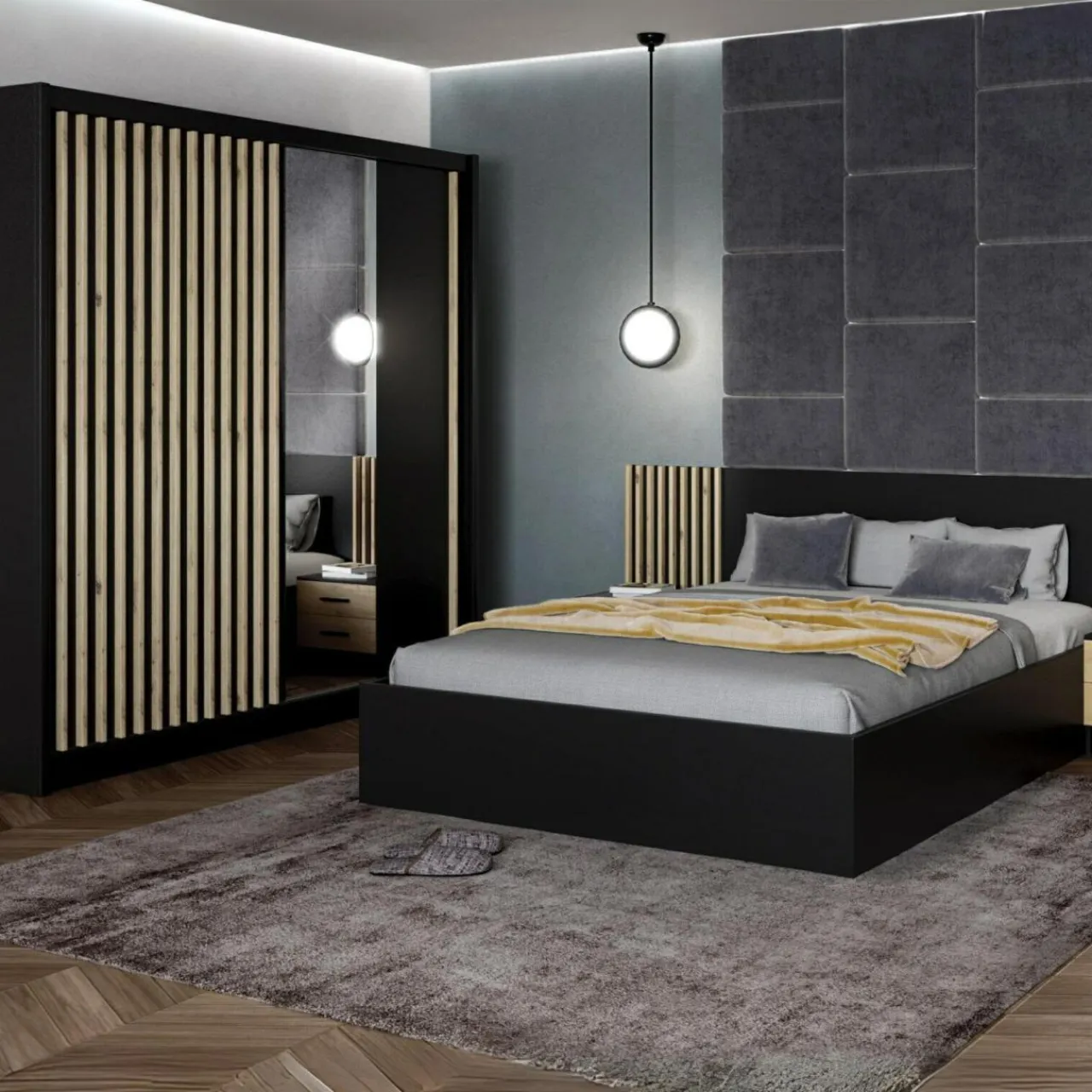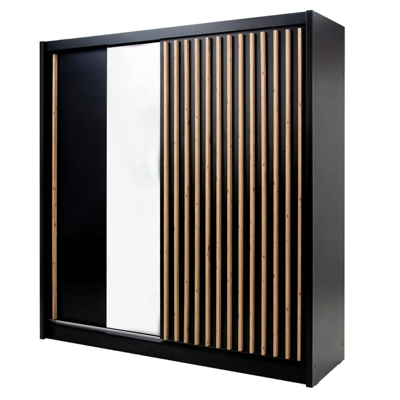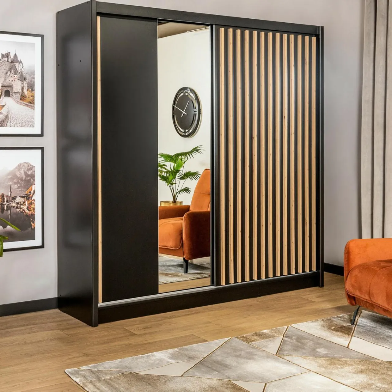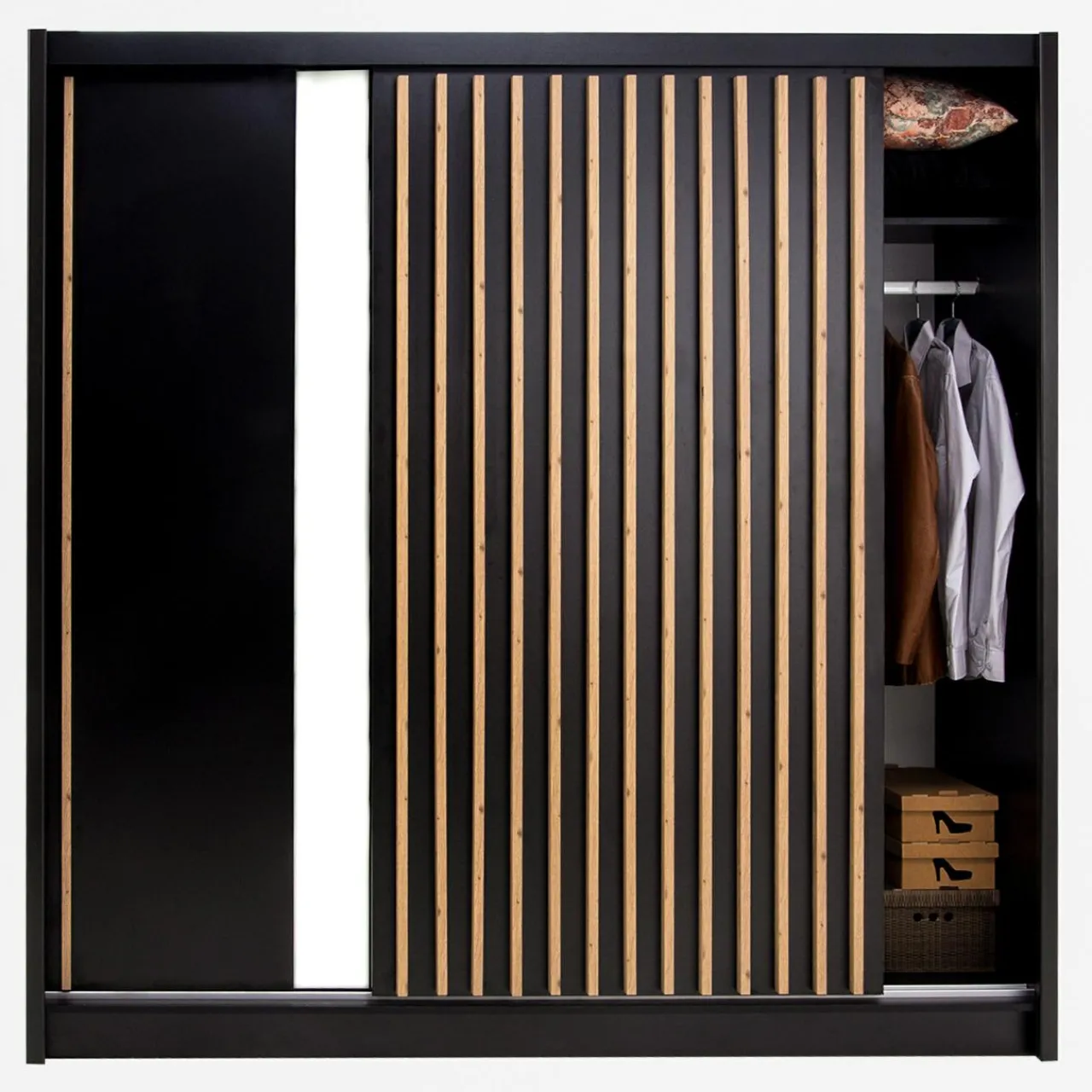 Szafa przesuwna z lamelami i lustrem LAMELLO to mebel, który idealnie dopełni wnętrza urządzone w stylu minimalistycznym, loftowym lub japandi.