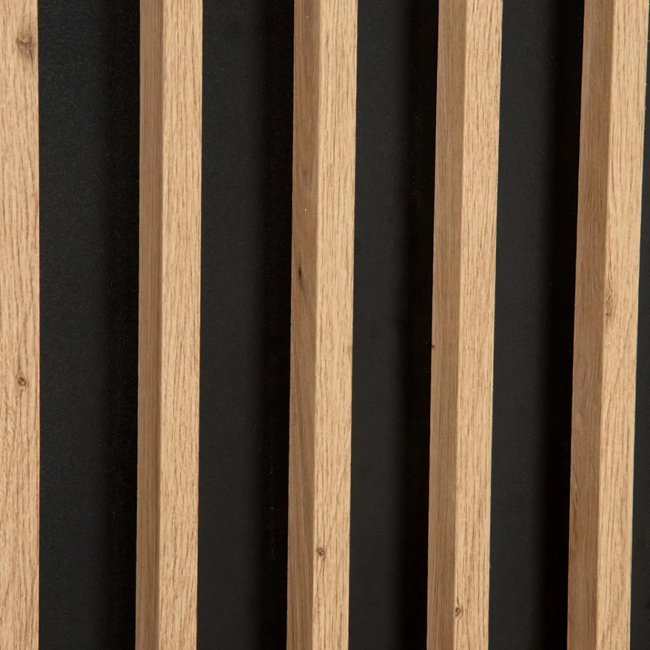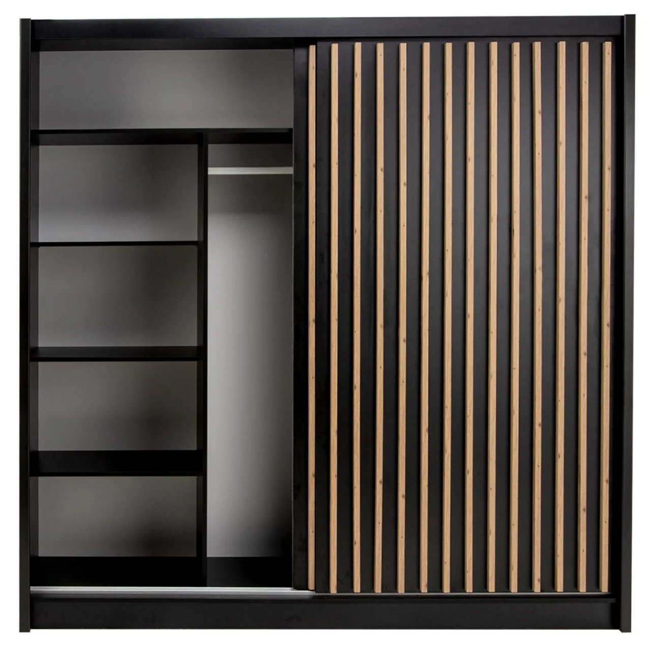 - Front stanowi czarna laminowana płyta ozdobiona lamelami w kolorze drewna. Lamele oprócz funkcji ozdobnej pełnią również rolę uchwytów. Wystarczy, że złapiesz za listwę i przesuniesz drzwi.