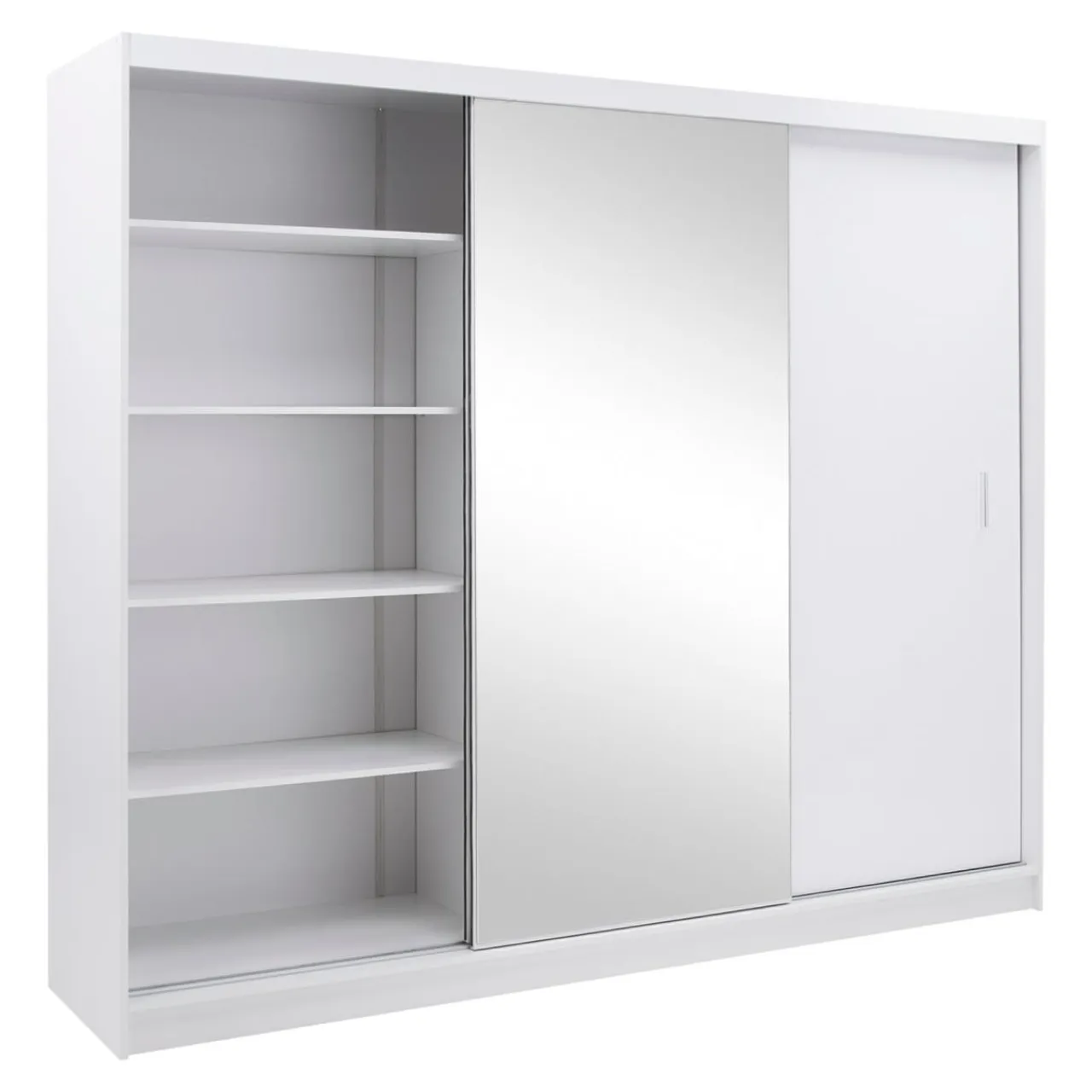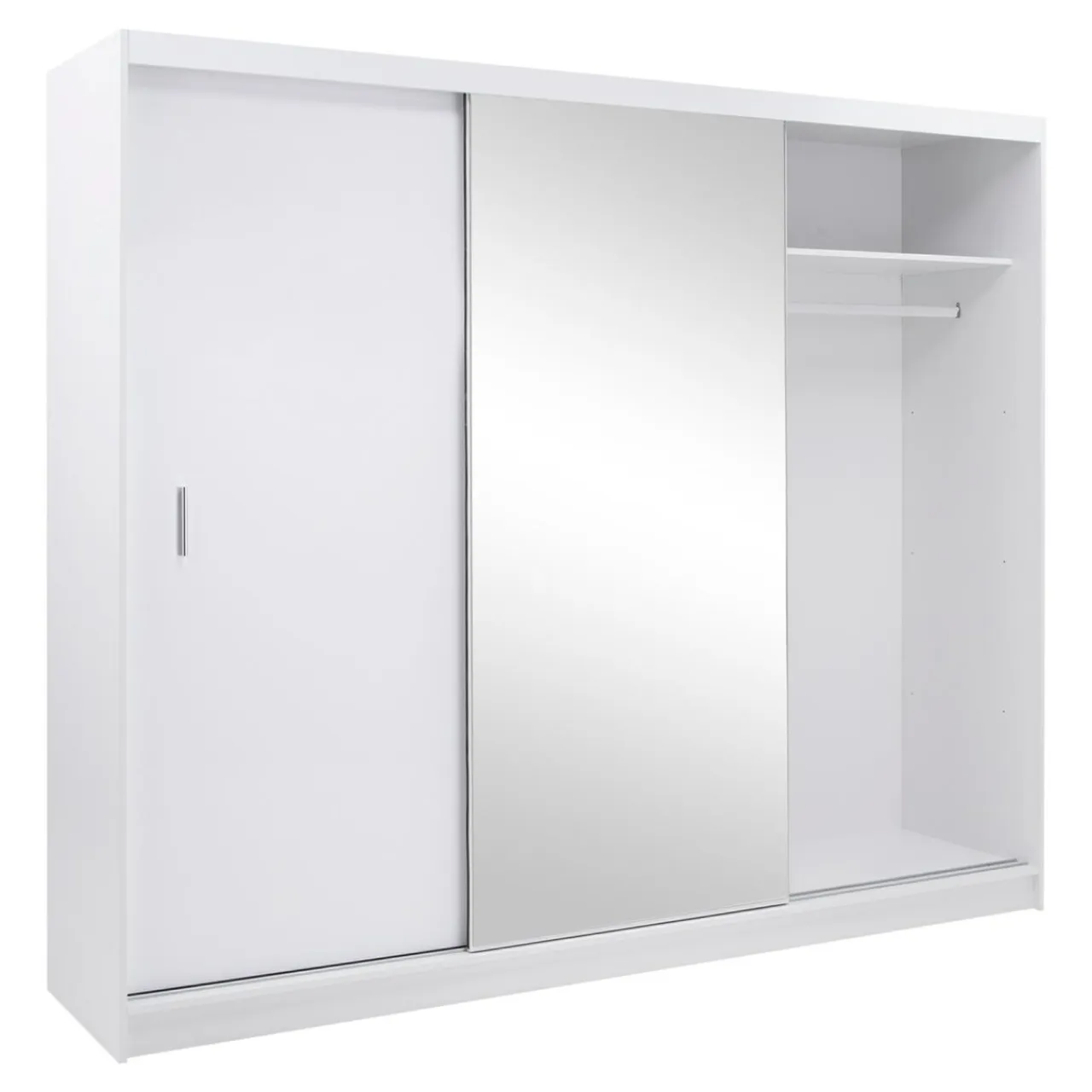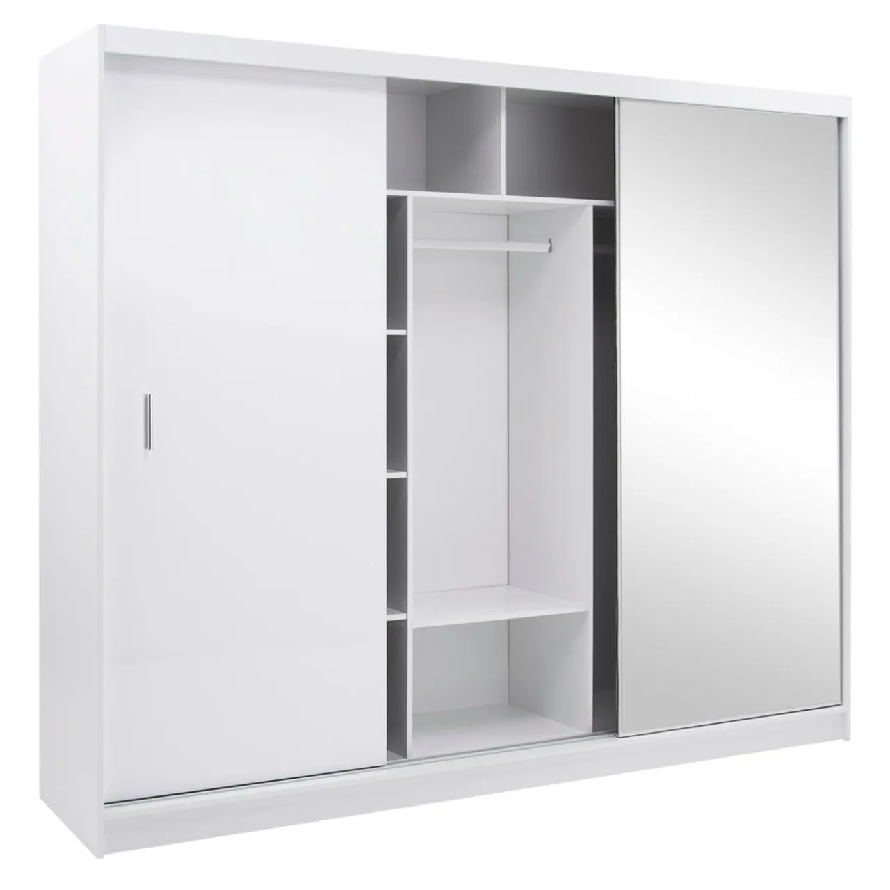 Biała szafa z lustrem MARSYLIA pomoże zorganizować zarówno wieszaki z sukienkami, koszulami czy płaszczami, a poskładane ubrania i akcesoria przechowasz w dużych wnękach.