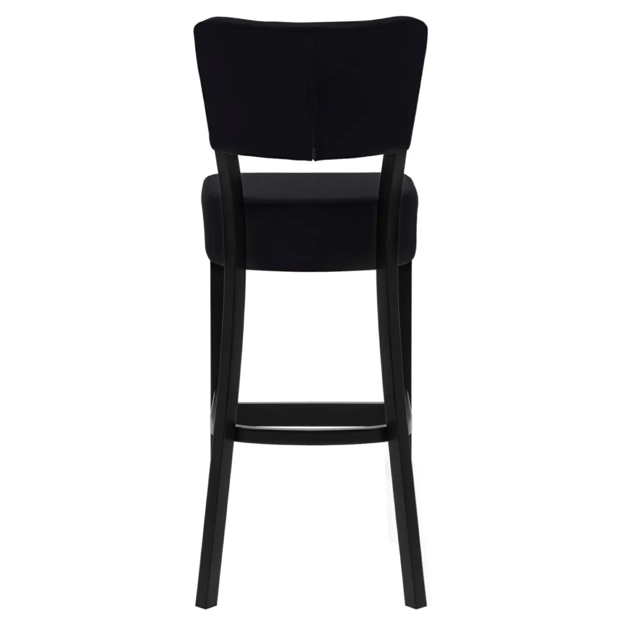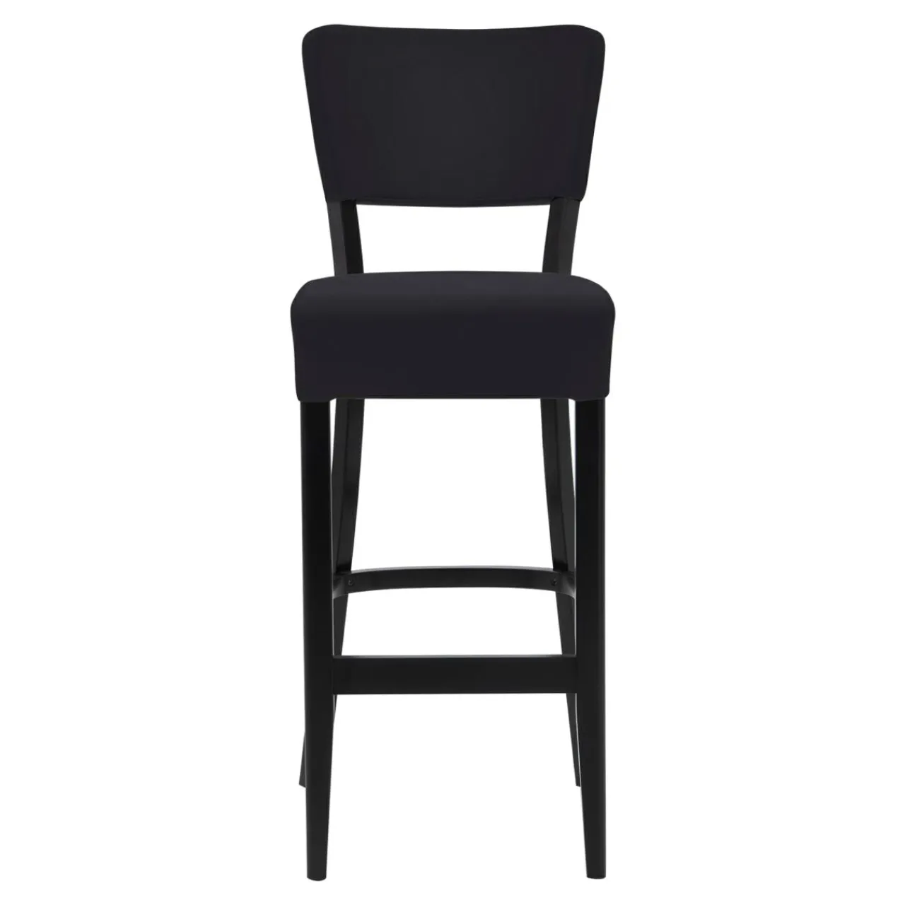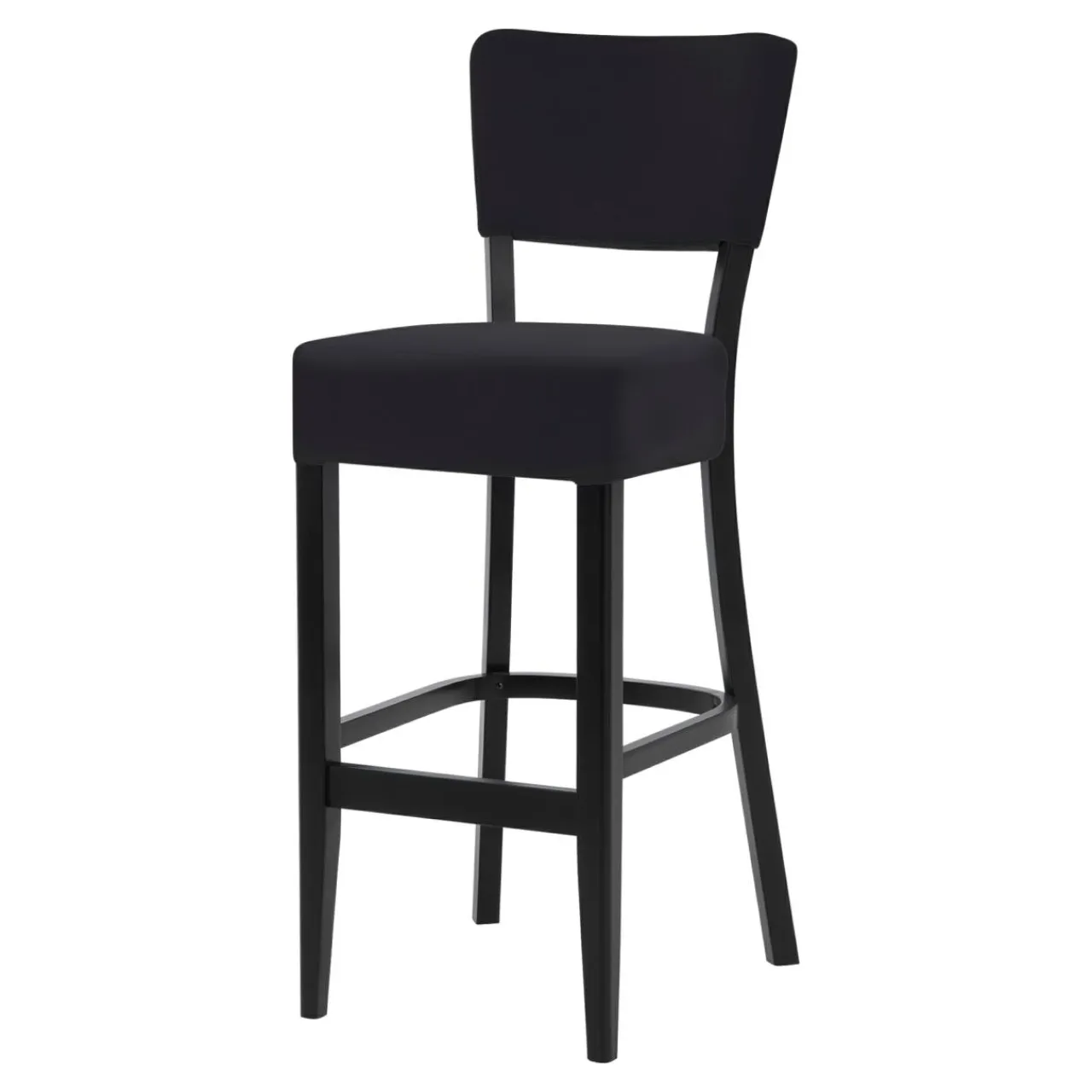 Krzesło barowe RYAN ma czarną podstawę, a siedzisko i oparcie pokryte czarną tkaniną. Będzie się prezentować stylowo w każdym wnętrzu.