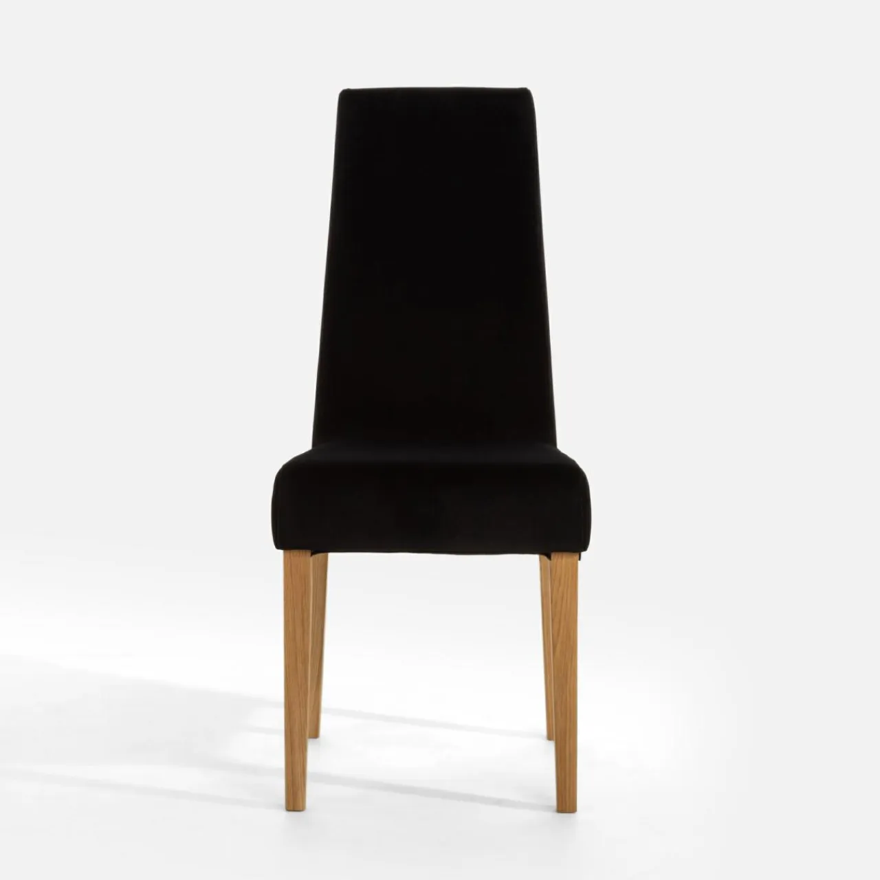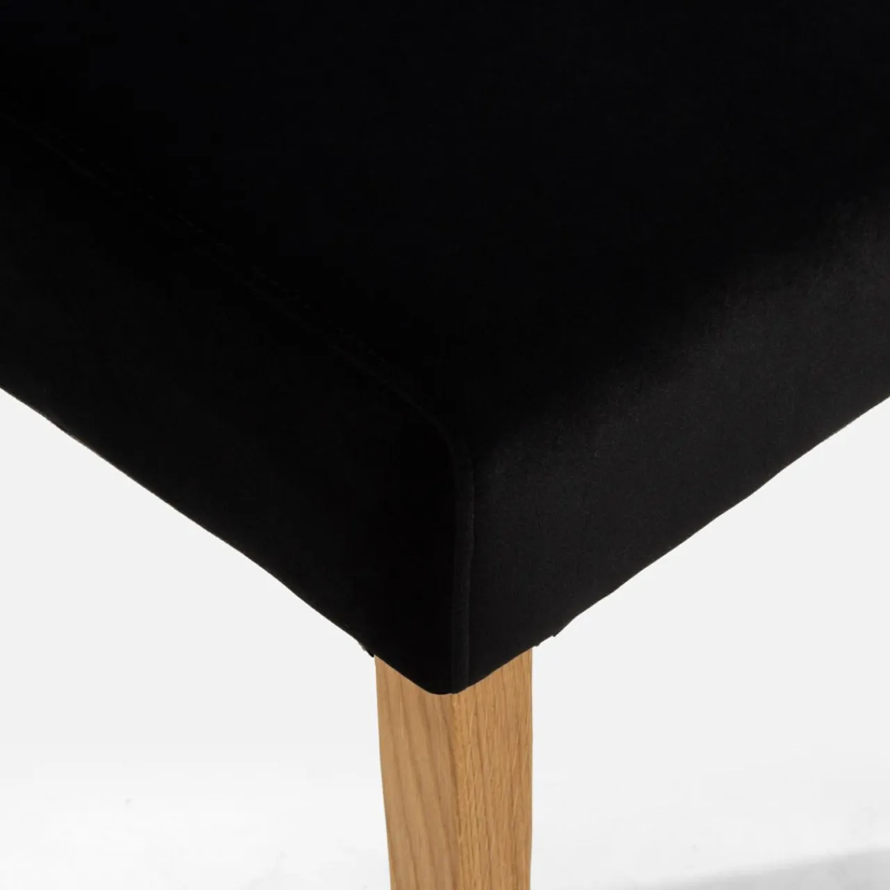 Czarny, miękki welur połączony z jasnym drewnem dębowym bez problemu dopasujesz do większości nowoczesnych pomieszczeń.