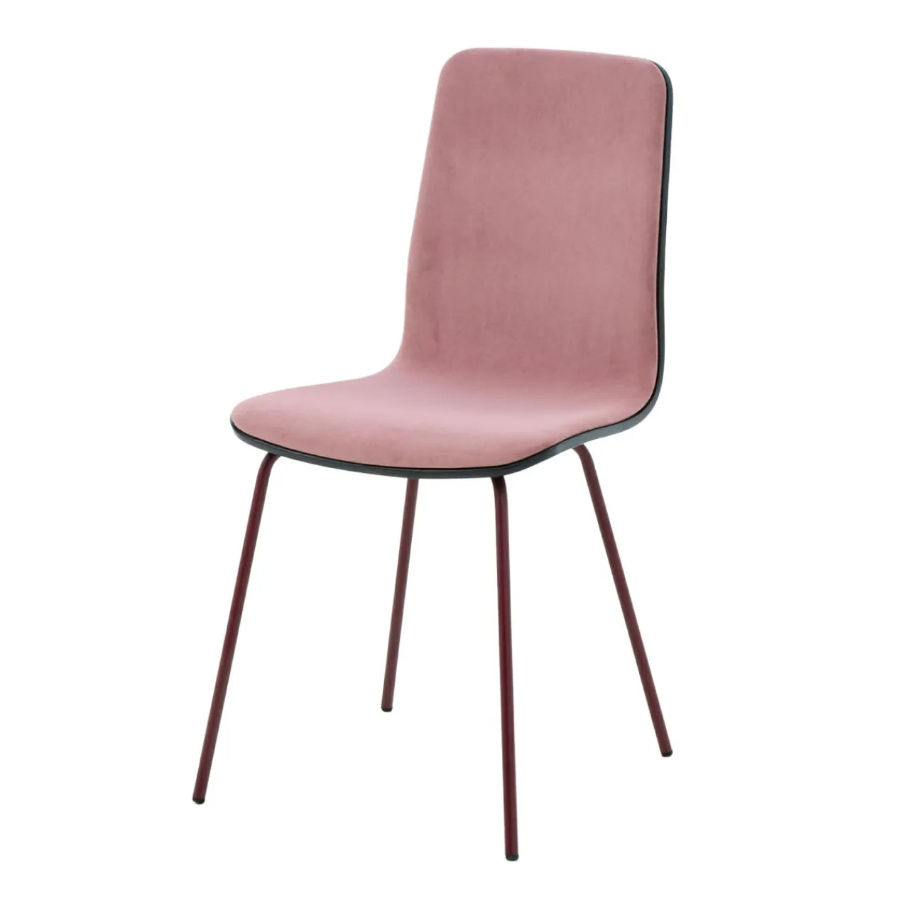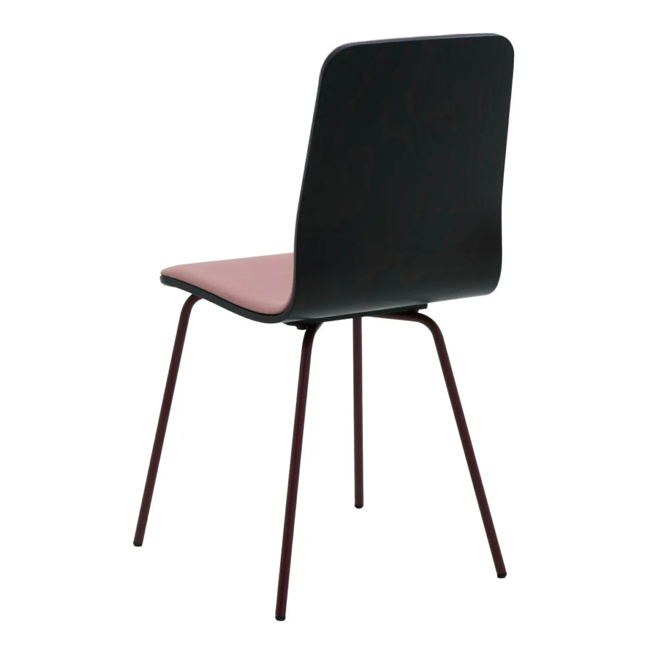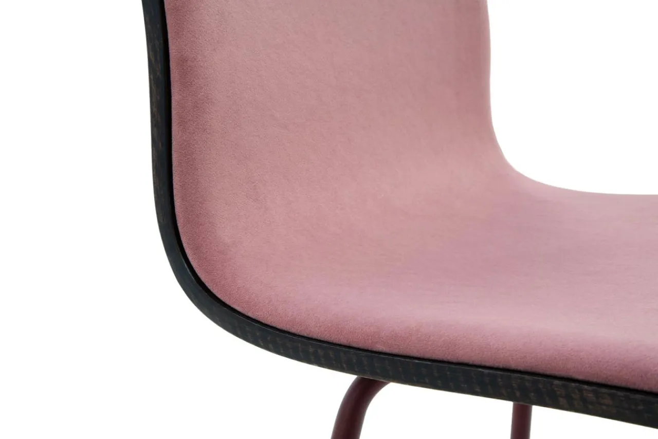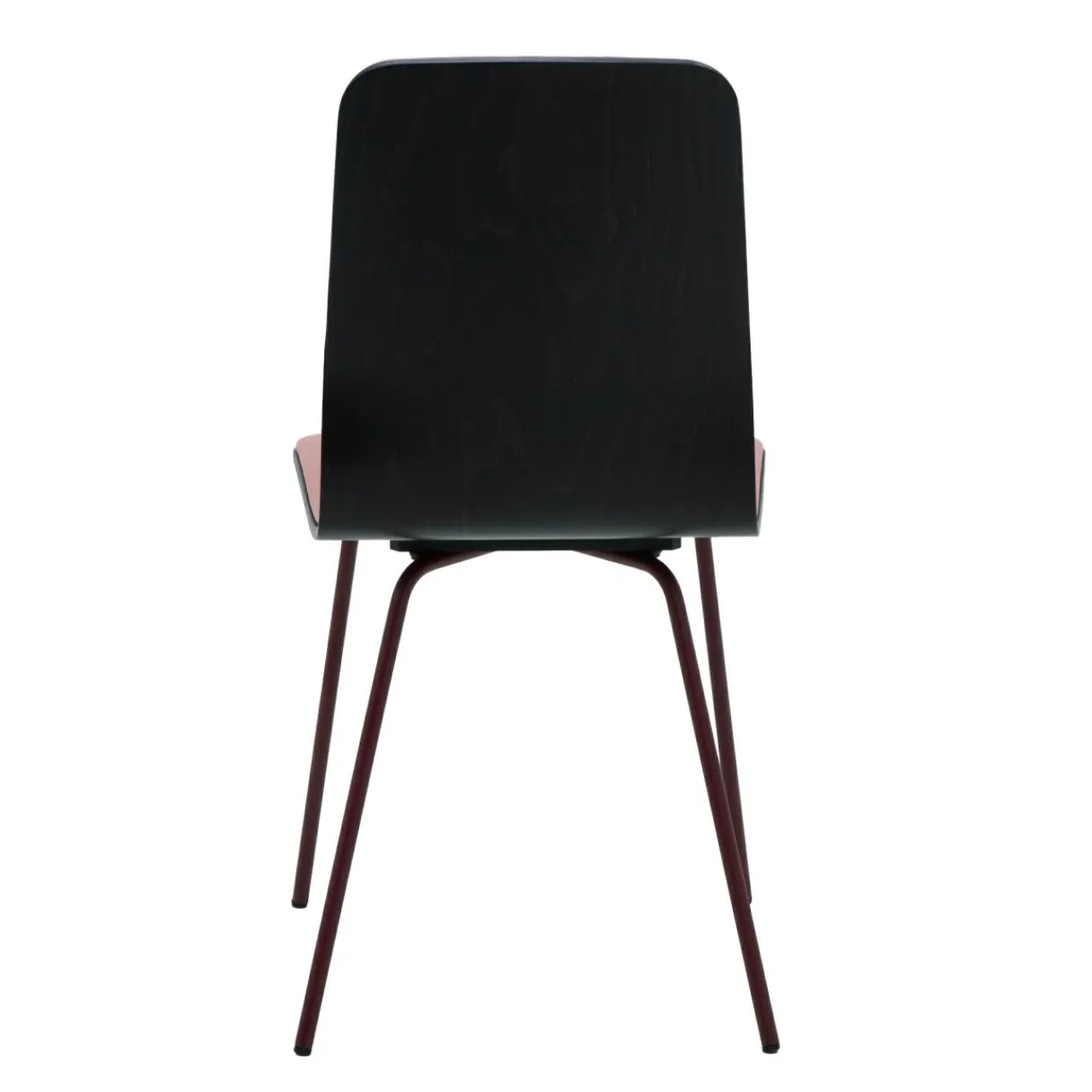 - Smukłe nóżki krzesła wykonano z metalu. Pomalowano je na bordowy kolor.