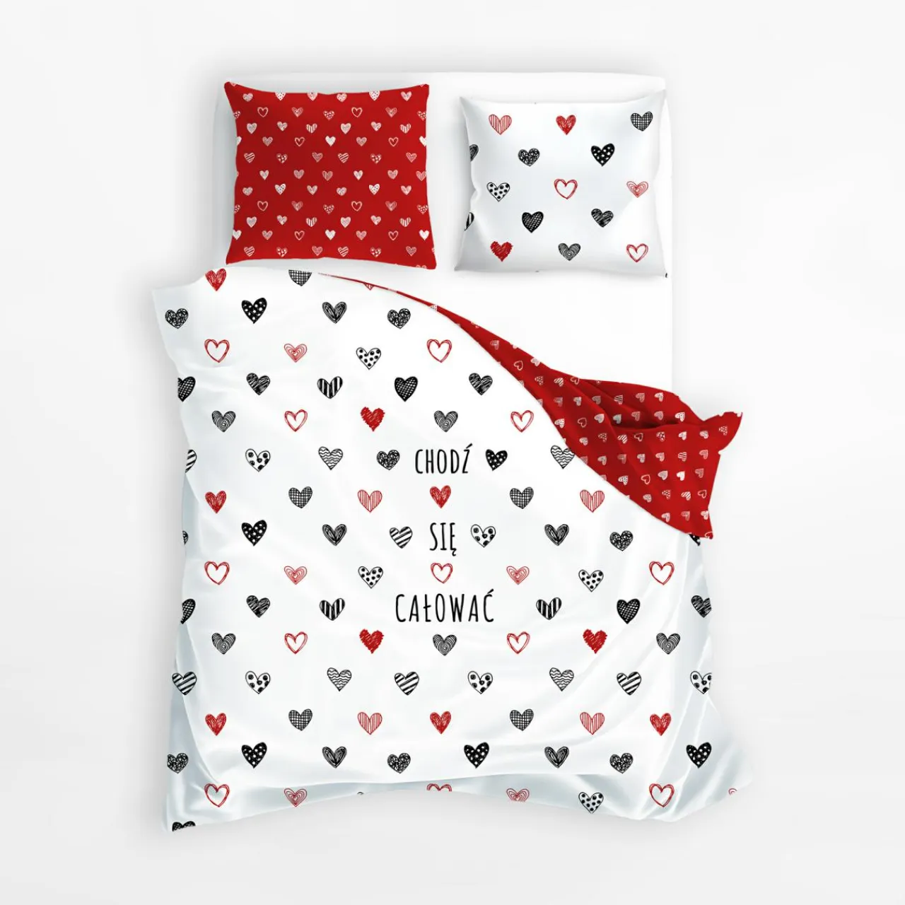 Wprowadź do sypialni romantyczny nastrój z odrobiną humoru. Pościel SPOKO SPANKO pocałunki jest pełna serduszek, a napisz między nimi wyraźnie komunikuje plany domowej randki.