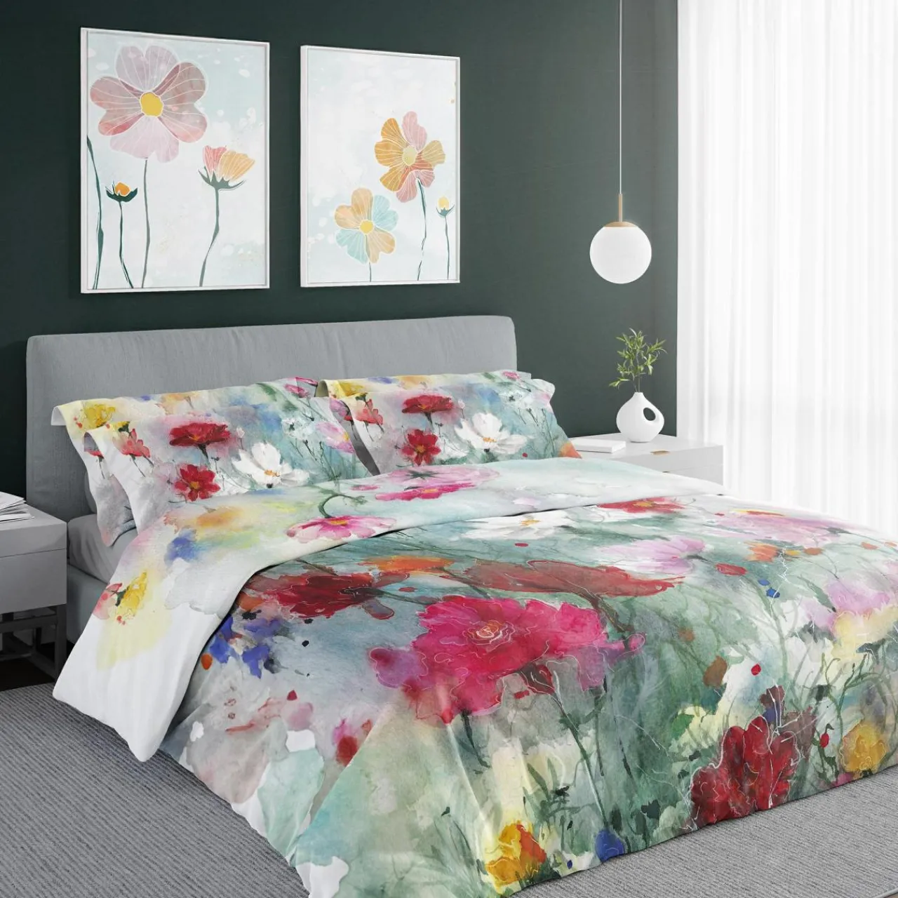 - Wyjątkowy design sprawia, że pościel wygląda jak wykonany akwarelami obraz. Eteryczne, przenikające się plamy barw oraz bogactwo kolorów czynią z kompletu wyjątkową ozdobę, która nada Twojej sypialni głębi i romantycznej elegancji.