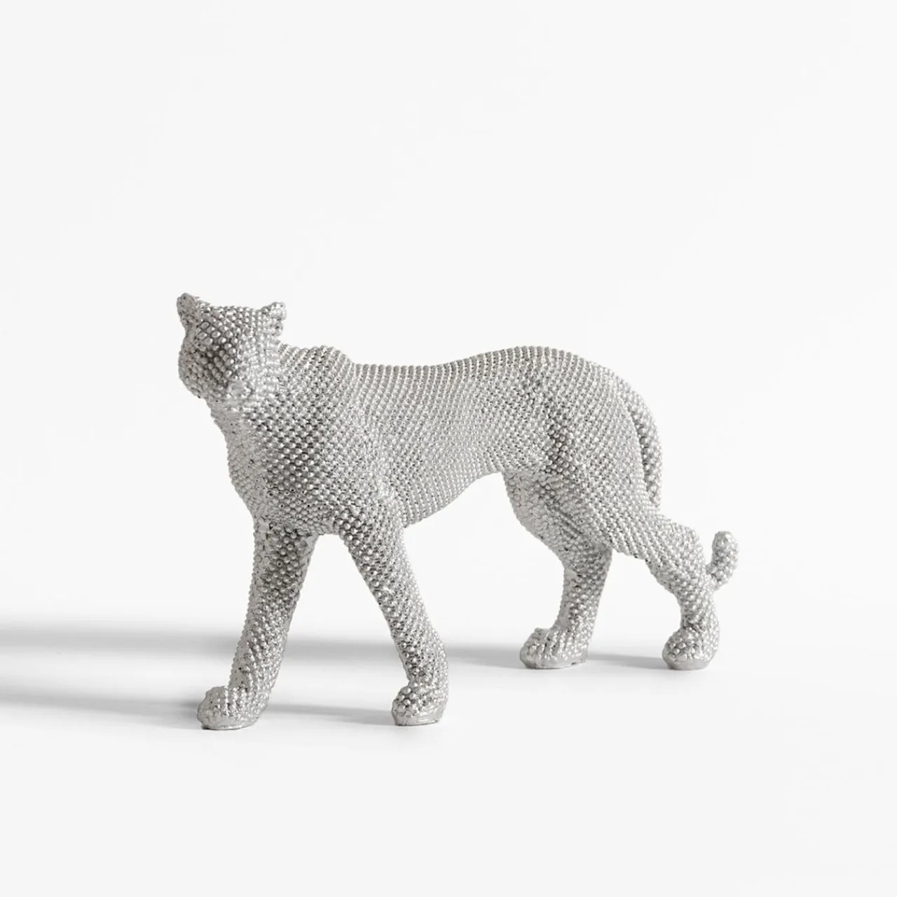 Figurka dekoracyjna PANTERA to elegancki element wystroju wnętrza, który ucieszy każdego miłośnika błyszczących ozdób. Wykonana z naturalnej żywicy jest odporna na stłuczenia, a jej srebrny kolor nadaje jej luksusowego wyglądu.