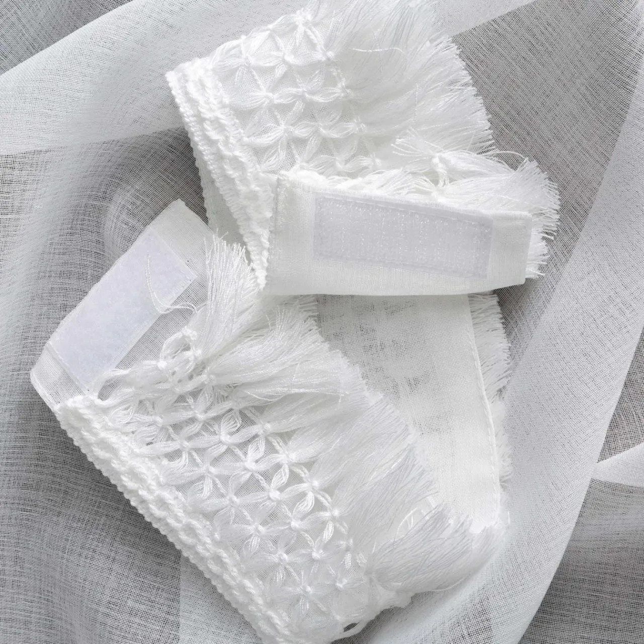 - Posiada dekoracyjną opaskę na rzep, która pozwala elegancko spiąć firanę.