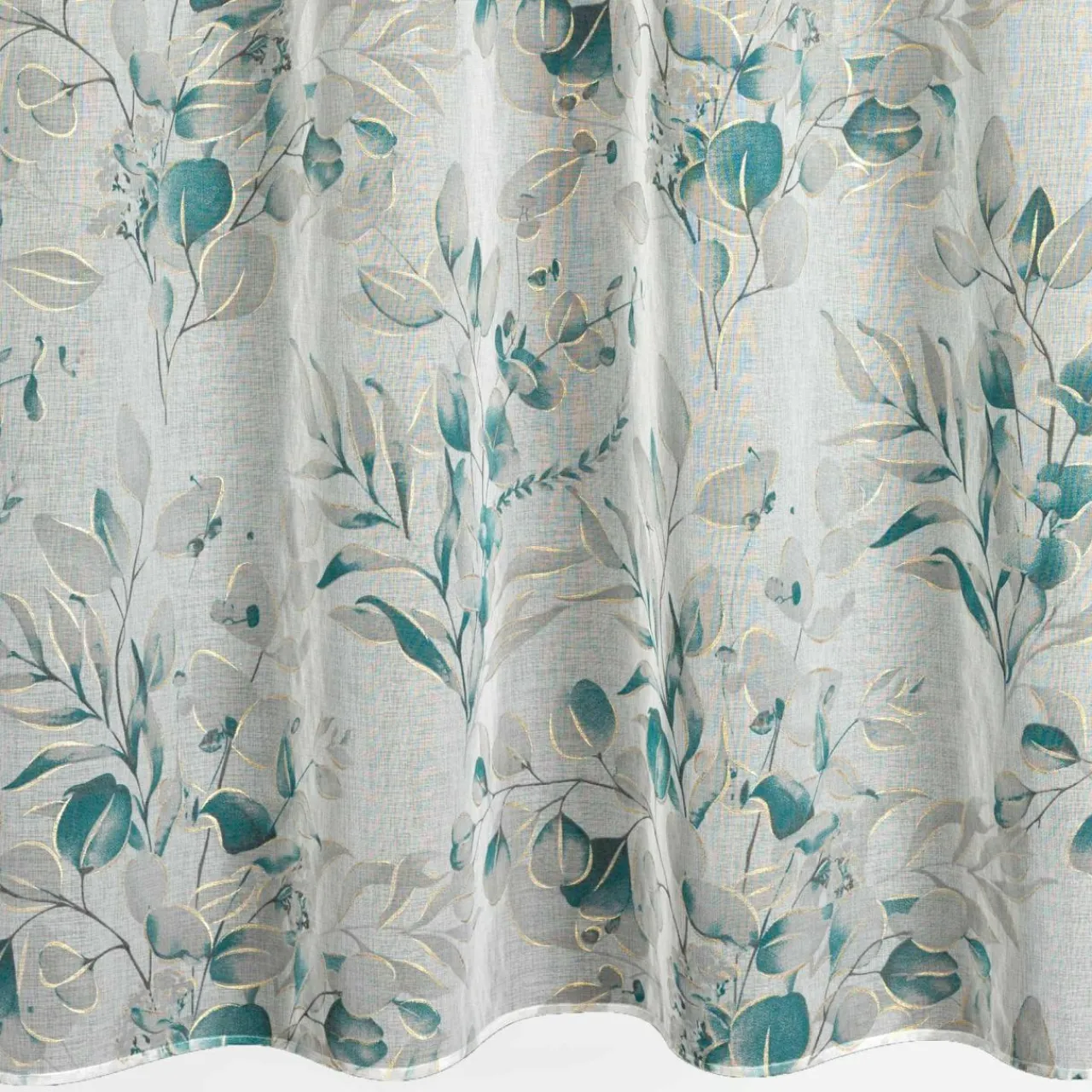 Zwiewna zasłona na przelotkach AVA z motywem liści muśniętych szampańskim złotem dopełni aranżację w stylu glamour.