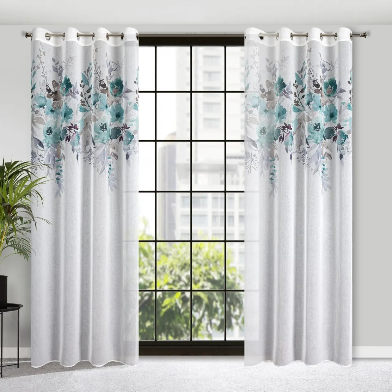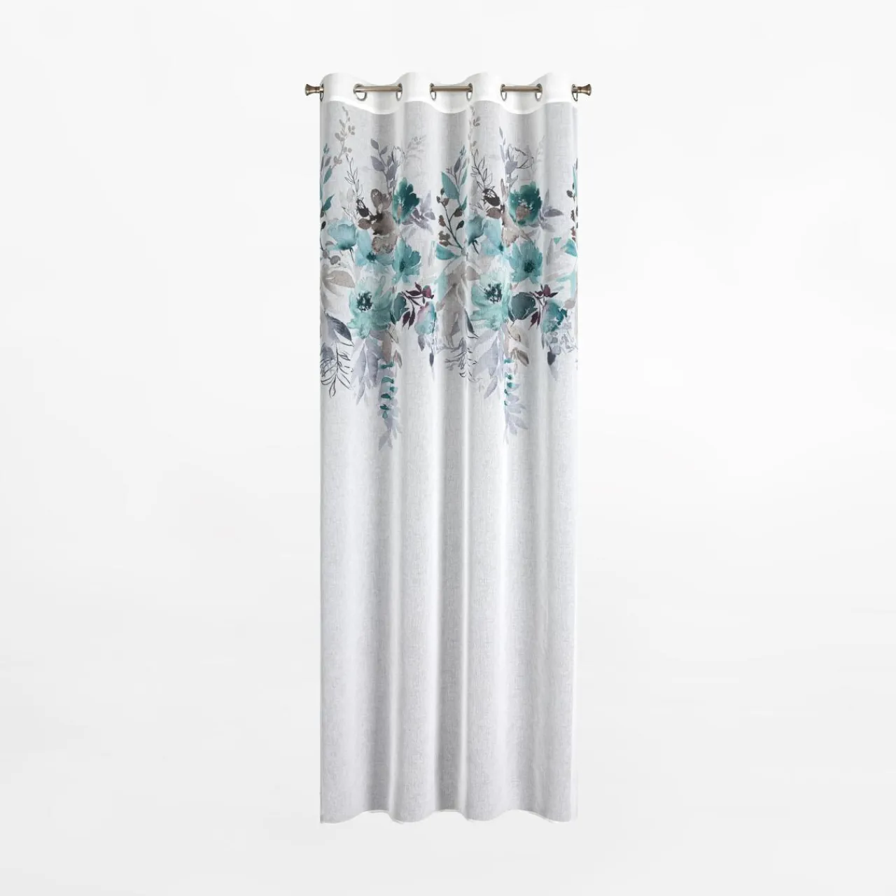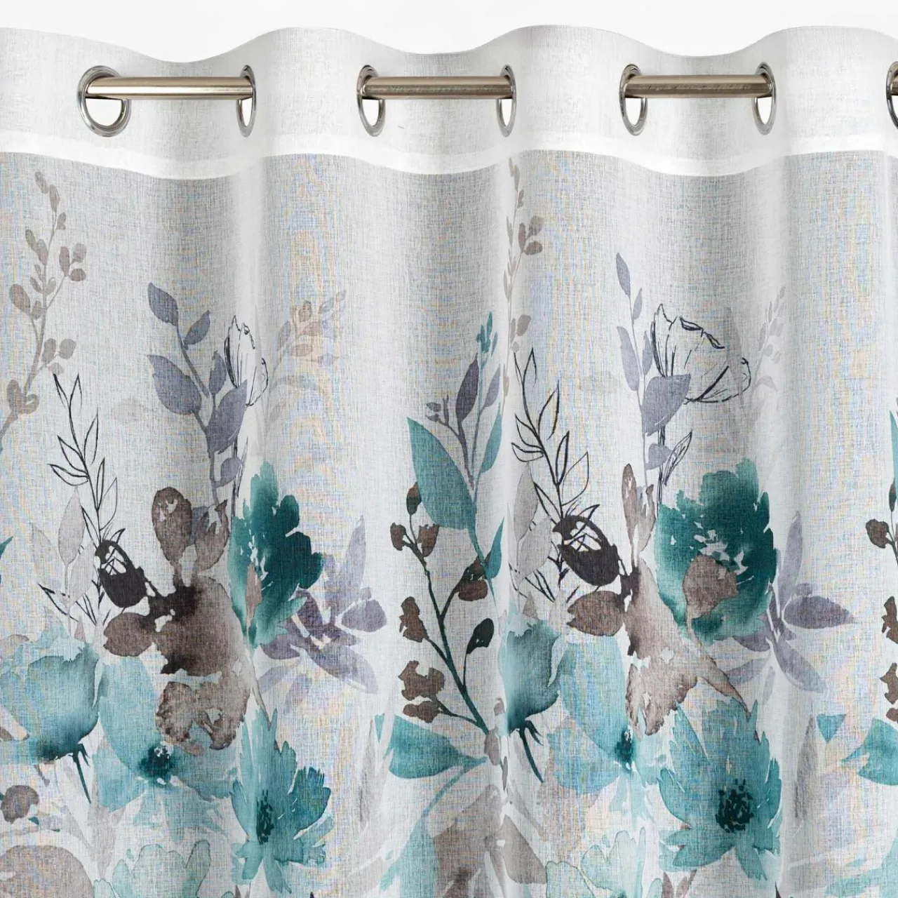 Lekka i zwiewna zasłona na przelotkach GRETA w turkusowe kwiaty doda wnętrzu wiosennego akcentu.