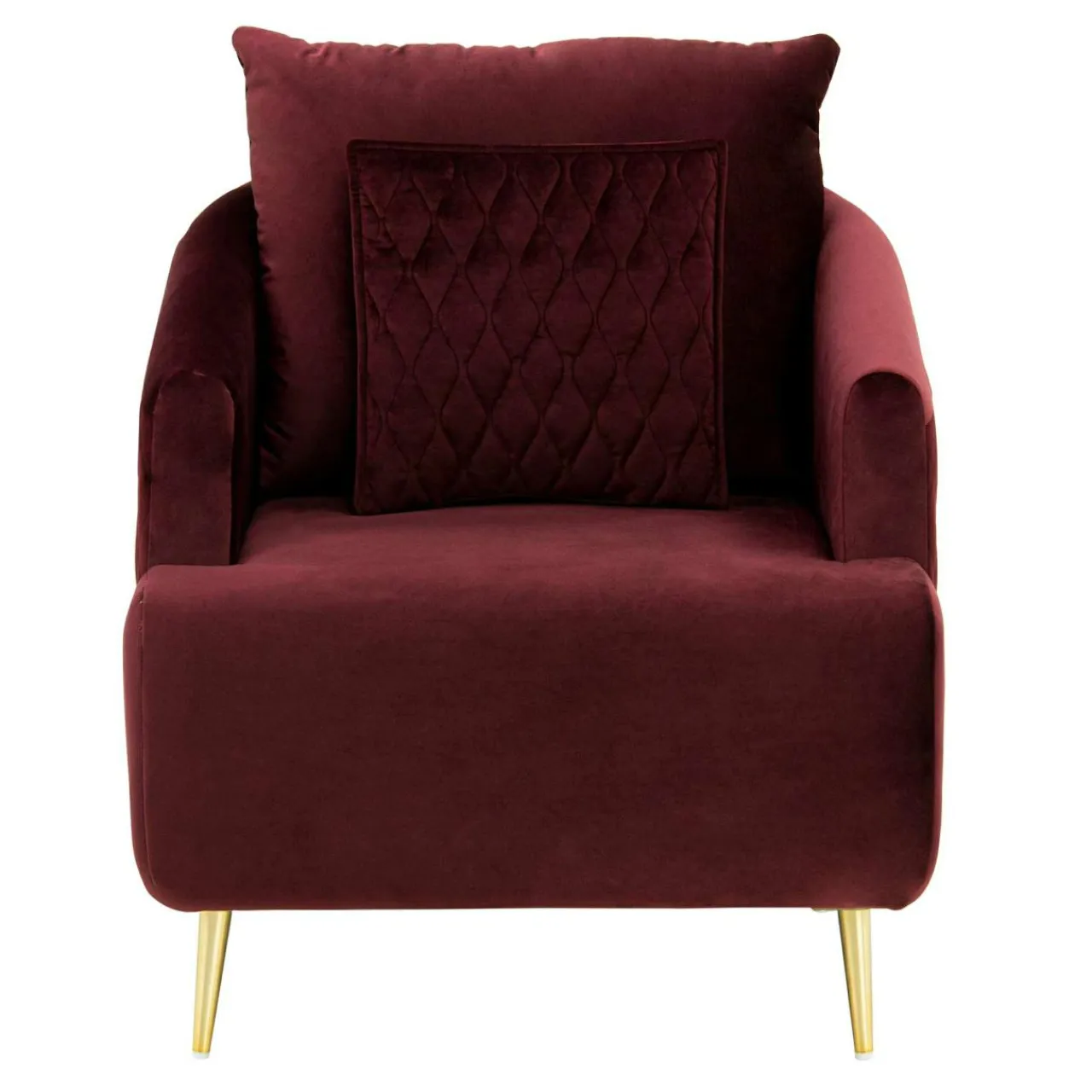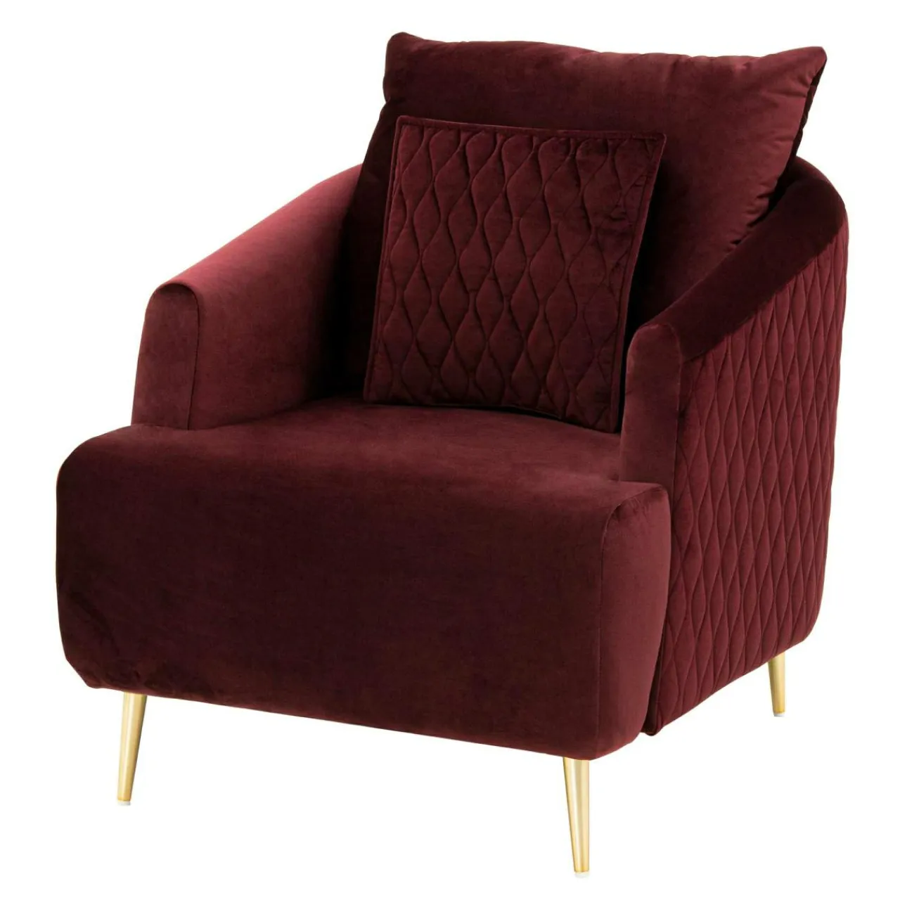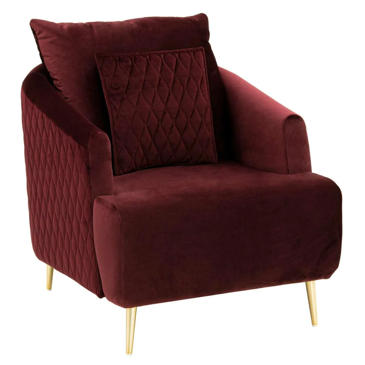 - Boki fotela i ozdobna poduszka posiadają ten sam kolor tapicerki, urozmaicono je natomiast dekoracyjnym pikowaniem.