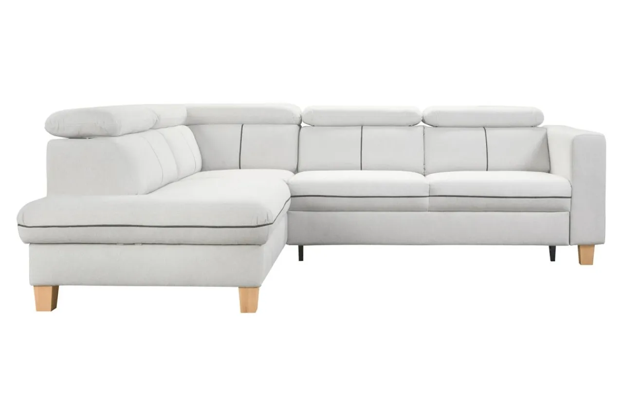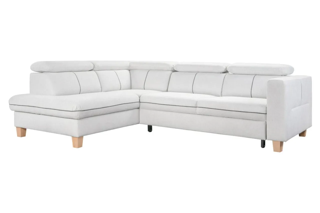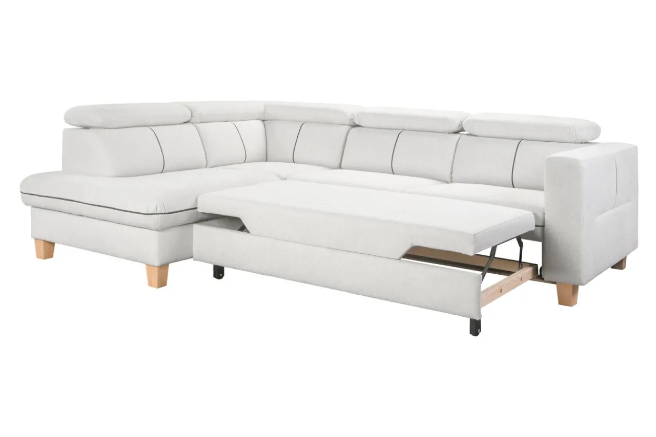 Do obicia narożnika wykorzystano tkaninę POLARIS. Tkanina jest odporna na mechacenie i ścieranie. Jej cechą charakterystyczną jest wyraźny splot nitek, który tworzy interesujący efekt wizualny. Kremowy narożnik posiada wyraziste, szare przeszycia, ładnie komponujące się z drewnianymi nóżkami.