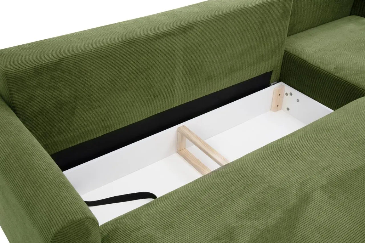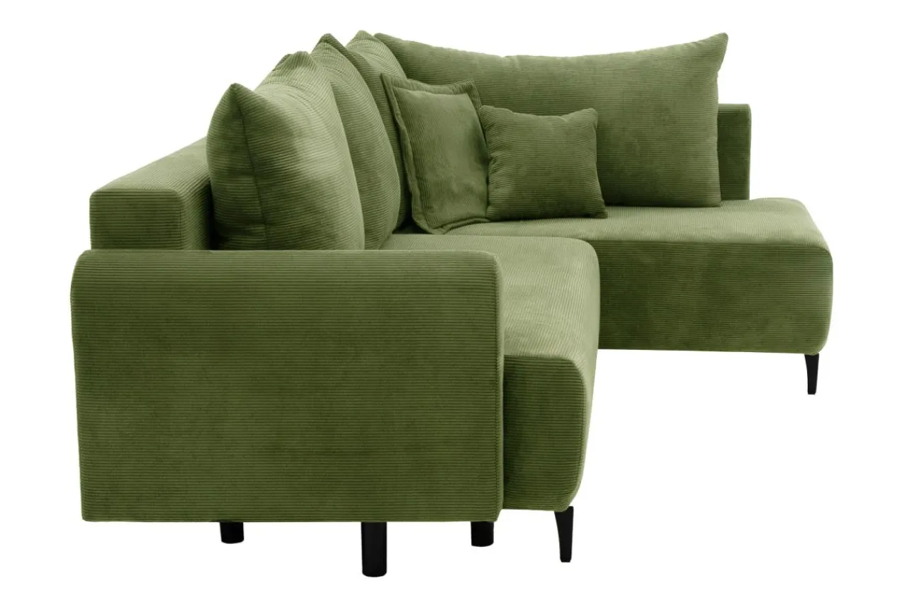 - Do obicia narożnika użyto mięsistej, sztruksowej tkaniny CAPRI w ciemnozielonym kolorze, którą docenisz za ciekawy wygląd i miękkość.